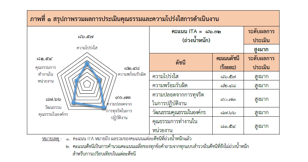 - ผลกำไรประเมินคุณธรรมและความโปร่งใสการดำเนินงานผลการประเมินระดับคุณธรรมและความโปร่งใสการดำเนินงาน โดยภาพรวมได้คะแนนเท่ากับร้อยละ 86.02 ซึ่งถือว่ามีคุณธรรมและความโปร่งใสการดำเนินงานระดับสูงมากดัชนีความปลอดจากการทุจริตในการปฏิบัติงาน ได้คะแนนสูงสุด เท่ากับร้อยละ 90.73