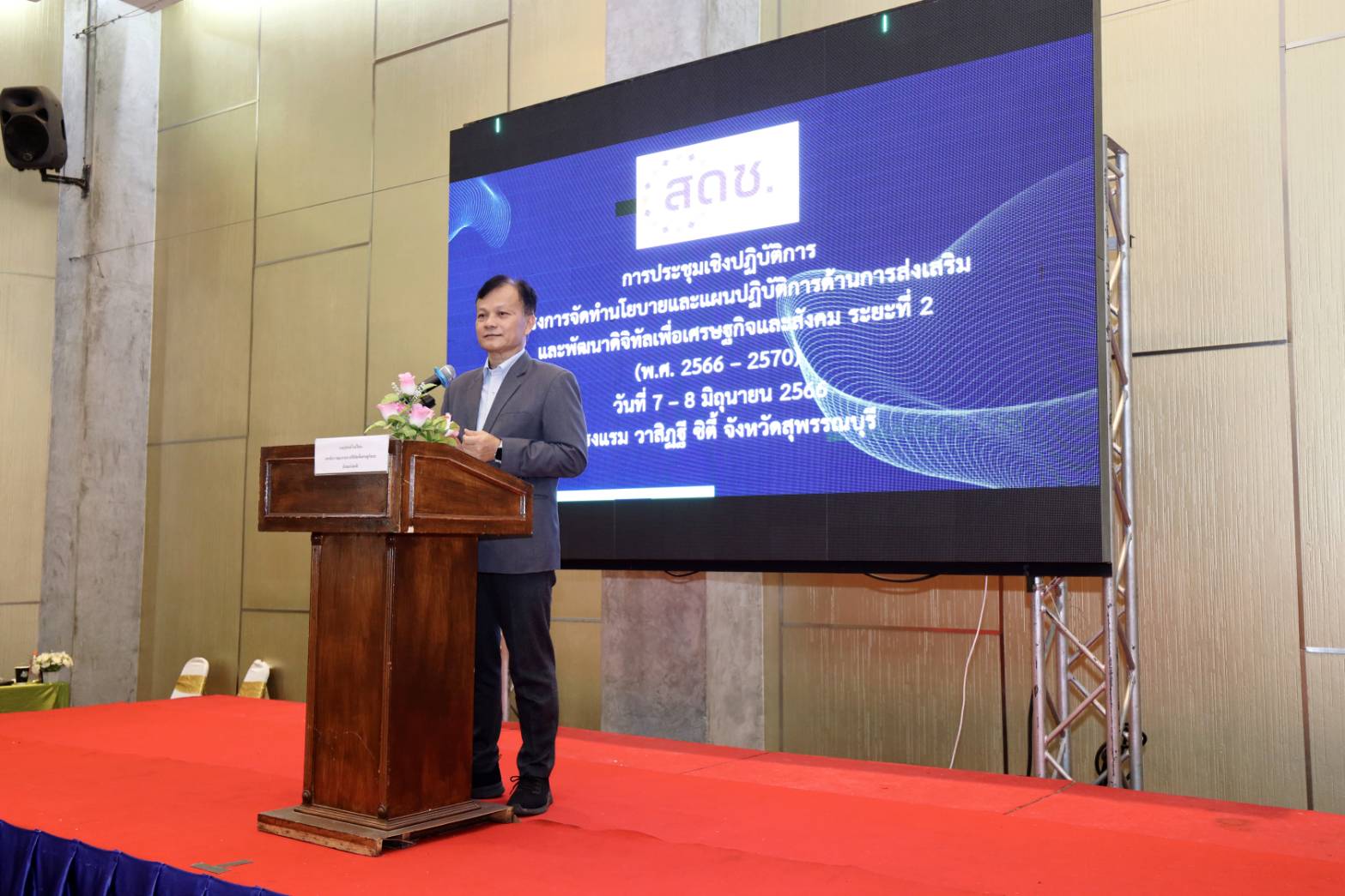 วันนี้ (7 มิถุนายน 2566) นายภุชพงค์ โนดไธสง เลขาธิการคณะกรรมการดิจิทัลเพื่อเศรษฐกิจและสังคมแห่งชาติ เป็นประธานการประชุมเชิงปฏิบัติการเพื่อระดมความคิดเห็นในกลุ่มพันธมิตร และผู้มีส่วนได้ส่วนเสีย (ภาครัฐ เอกชน และประชาสังคม) สำหรับการจัดทำ (ร่าง) นโยบายและแผนปฏิบัติการด้านการส่งเสริมและพัฒนาดิจิทัลเพื่อเศรษฐกิจและสังคม ระยะที่ 2 (พ.ศ. 2566 – 2570) และ (ร่าง) นโยบายและแผนปฏิบัติการด้านการพัฒนากำลังคนให้พร้อมเข้าสู่ยุคเศรษฐกิจและสังคมดิจิทัล ระยะที่ 2 (พ.ศ. 2566 – 2570) โดยมี นายปริญญา เขมะชิต รองผู้ว่าราชการจังหวัดสุพรรณบุรี นายสมเกียรติ ศิริวัฒนโชค ผู้เชี่ยวชาญเฉพาะด้านการบริหารจัดการเชิงนโยบาย นายสมบูรณ์ เมฆไพบูลย์วัฒนา ผู้เชี่ยวชาญเฉพาะด้านการบริหารเทคโนโลยีดิจิทัลและการสื่อสาร นางสาวรัตนา จรูญศักดิ์สิทธิ์ ผู้อำนวยการกองขับเคลื่อนดิจิทัลเพื่อสังคม สำนักงานคณะกรรมการดิจิทัลเพื่อเศรษฐกิจและสังคมแห่งชาติ (สดช.) และที่ปรึกษาจากมหาวิทยาลัยธรรมศาสตร์ เข้าร่วม ณ โรงแรมวาสิฏฐีซิตี้ จังหวัดสุพรรณบุรี โดยการจัดประชุมดังกล่าว จัดขึ้นเพื่อรับฟังความคิดเห็นจากผู้มีส่วนได้ส่วนเสีย โดยเป็นการสะท้อนถึงสภาพปัญหา อุปสรรค ทัศนคติที่มีต่อการพัฒนาเทคโนโลยีดิจิทัลในปัจจุบัน นำไปสู่แนวทางการแก้ไขปัญหาอย่างเป็นรูปธรรม ซึ่งจะช่วยส่งเสริมการสร้างสังคมดิจิทัลที่มีคุณภาพและลดความเหลื่อมล้ำทางโอกาสของประชาชนที่เกิดจากการเข้าไม่ถึงโครงสร้างพื้นฐานและขาดความรู้ความเข้าใจด้านเทคโนโลยีดิจิทัล พร้อมทั้งกำหนดแนวทางและมาตรการพัฒนากำลังคนดิจิทัลเพื่อรองรับการทำงานในระบบเศรษฐกิจดิจิทัล ทั้งกลุ่มคนทำงานและกลุ่มคนที่เป็นผู้เชี่ยวชาญด้านดิจิทัล