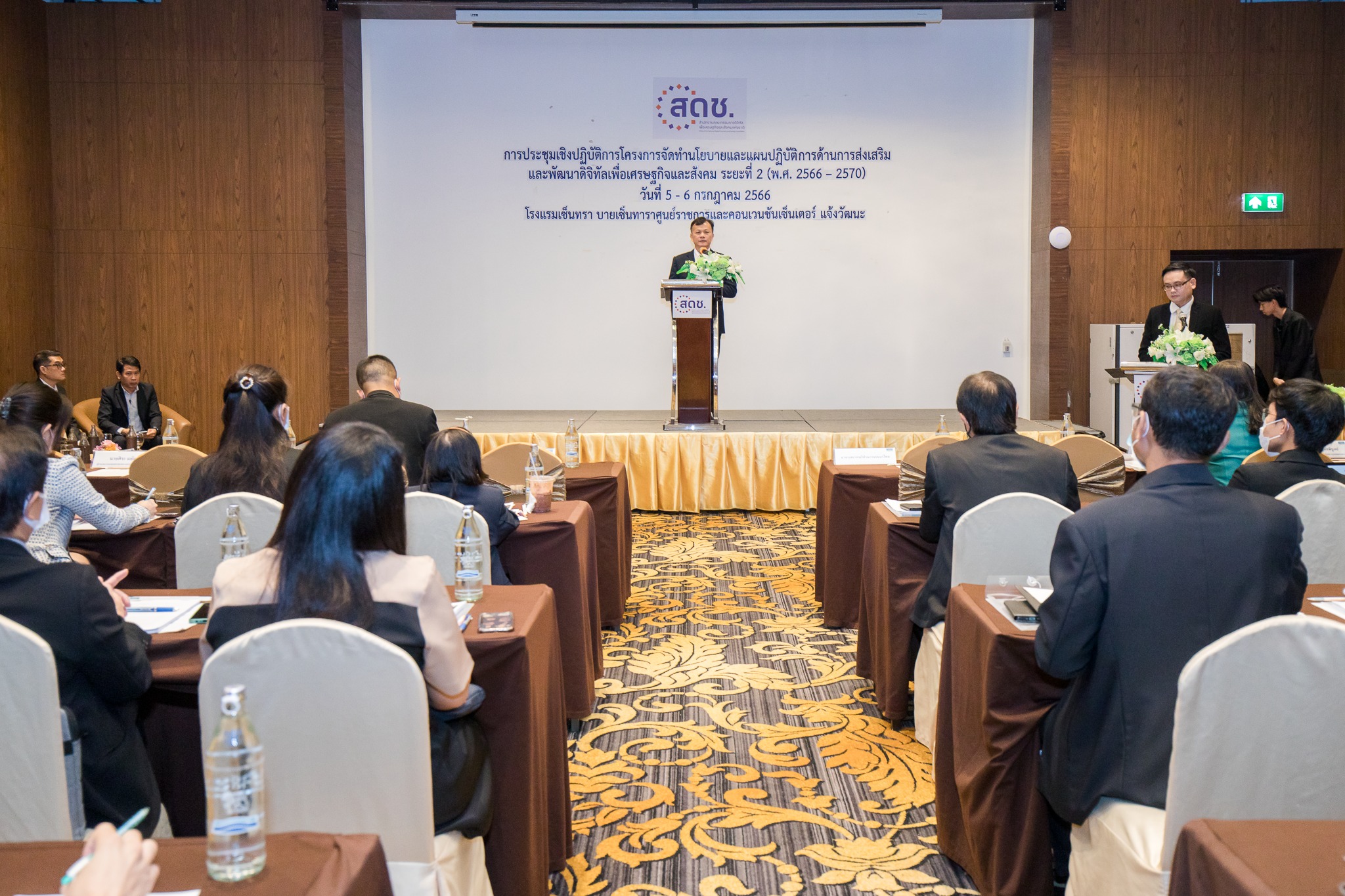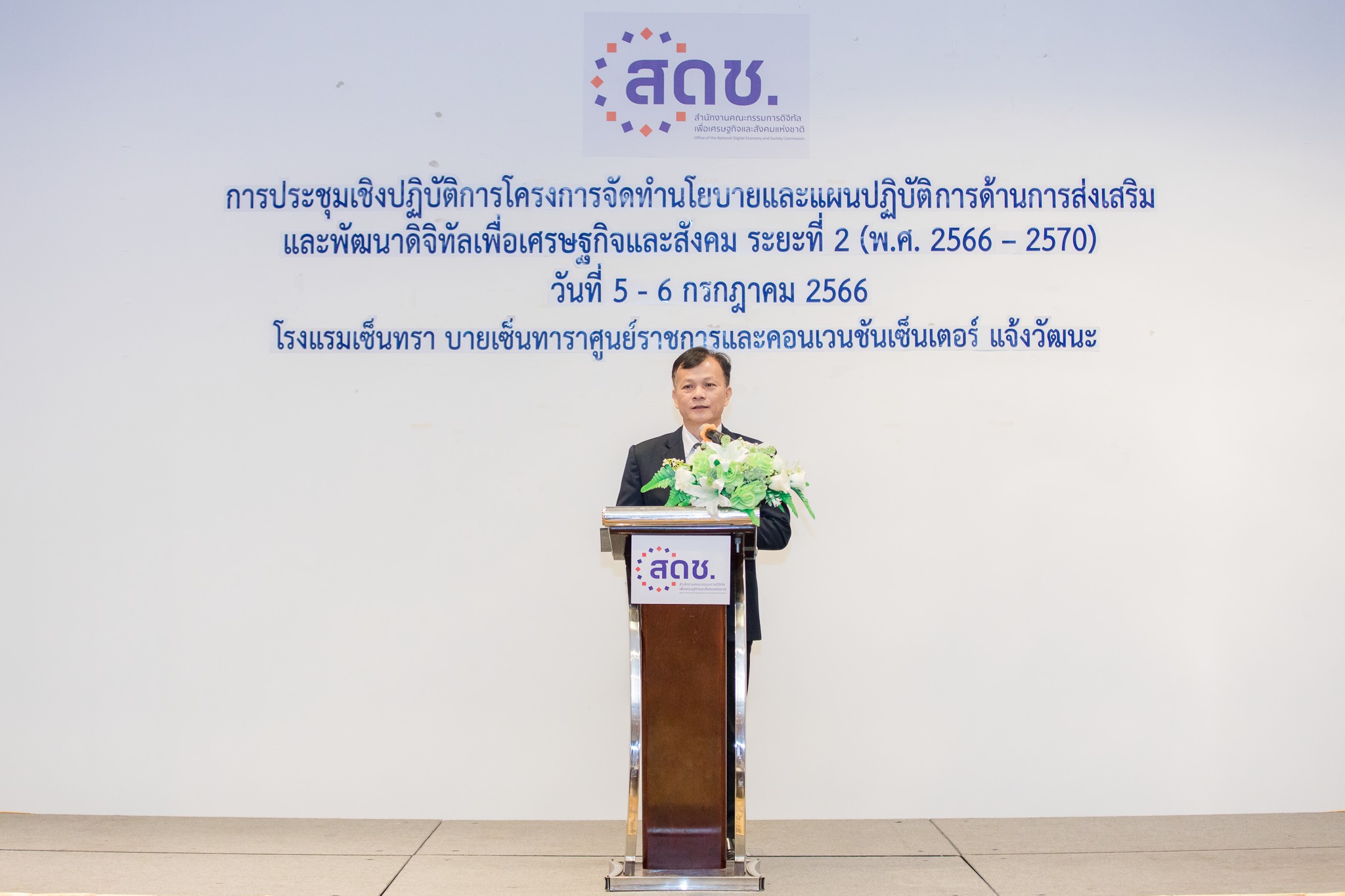 วันนี้ (5 กรกฎาคม 2566) นายภุชพงค์ โนดไธสง เลขาธิการคณะกรรมการดิจิทัลเพื่อเศรษฐกิจและสังคมแห่งชาติ เป็นประธานการประชุมเชิงปฏิบัติการเพื่อระดมความคิดเห็นในกลุ่มพันธมิตร และผู้มีส่วนได้ส่วนเสีย (ภาครัฐ เอกชน และประชาสังคม) ภายใต้โครงการจัดทำนโยบายและแผนปฏิบัติการด้านการส่งเสริมและพัฒนาดิจิทัลเพื่อเศรษฐกิจและสังคม ระยะที่ 2 (พ.ศ. 2566 - 2570) ทั้งนี้ ภายในงานมีการบรรยายในหัวข้อ “บทบาทของ สดช. ในการส่งเสริมและพัฒนาดิจิทัลเพื่อเศรษฐกิจและสังคม” และการบรรยายในหัวข้อ “นโยบายการส่งเสริมและพัฒนาดิจิทัลเพื่อเศรษฐกิจและสังคมส่วนภูมิภาค” ณ โรงแรม เซ็นทรา บาย เซ็นทารา ศูนย์ราชการ และคอนเวนชันเซ็นเตอร์ แจ้งวัฒนะ กรุงเทพฯ