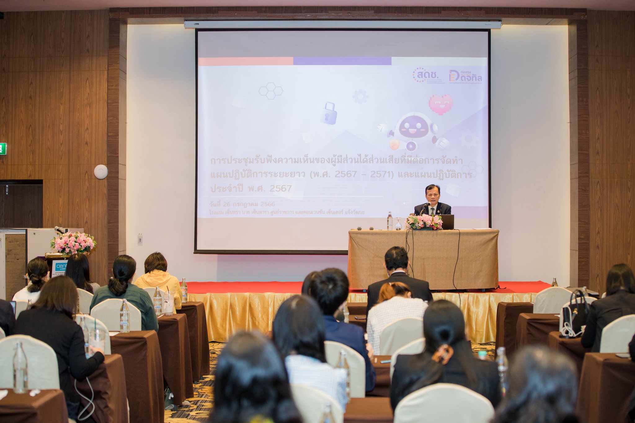 (26 กรกฎาคม 2566) นายภุชพงค์ โนดไธสง เลขาธิการคณะกรรมการดิจิทัลเพื่อเศรษฐกิจและสังคมแห่งชาติ เป็นประธานเปิดประชุมรับฟังความเห็นของผู้มีส่วนได้ส่วนเสียที่มีต่อการจัดทำแผนปฏิบัติการระยะยาว (พ.ศ. 2567 - 2571) และแผนปฏิบัติการประจำปี พ.ศ. 2567 ภายใต้โครงการกำกับ ติดตาม บริหารจัดการแผนงานและตัวชี้วัดของกองทุนพัฒนาดิจิทัลเพื่อเศรษฐกิจและสังคม โดยมีนางสุรีพร พรโสภณวิชญ์ ผู้อำนวยการกองบริหารกองทุนพัฒนาดิจิทัลเพื่อเศรษฐกิจและสังคม และนางสาวณิชาพร สุขเจริญ ผู้อำนวยการศูนย์ข้อมูลเศรษฐกิจและสังคมดิจิทัล สำนักงานคณะกรรมการดิจิทัลเพื่อเศรษฐกิจและสังคมแห่งชาติ เข้าร่วม ณ โรงแรม เซ็นทรา บาย เซ็นทารา ศูนย์ราชการ และคอนเวนชัน เซ็นเตอร์ แจ้งวัฒนะ