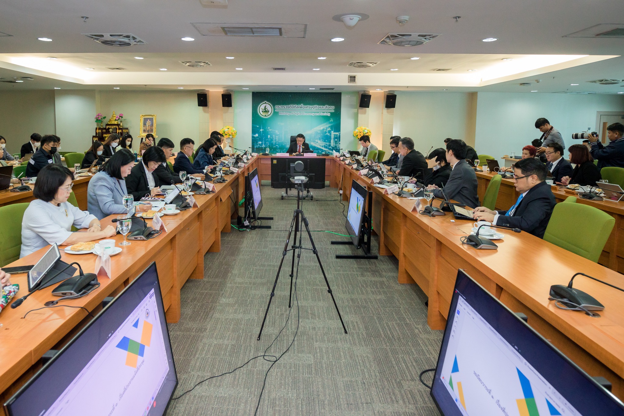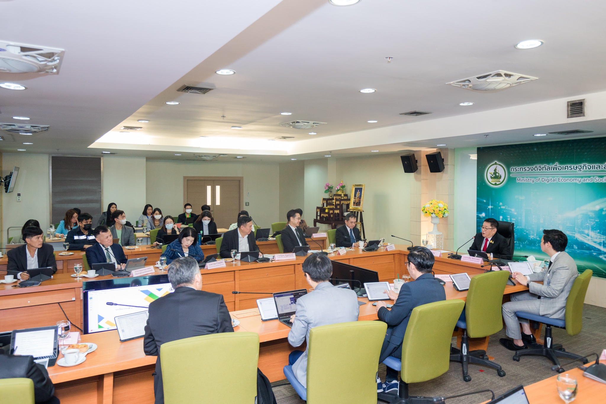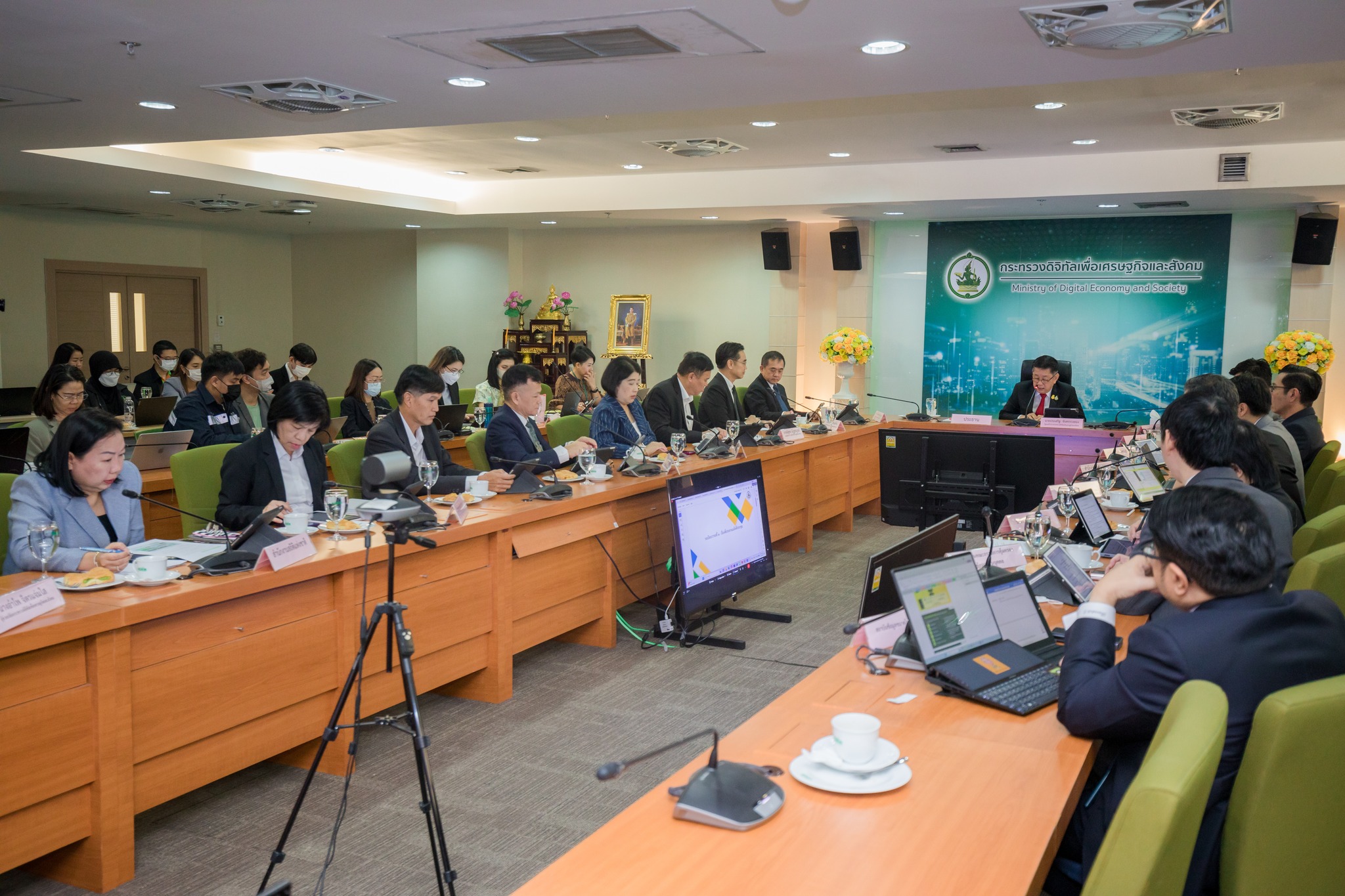วันนี้ (8 พฤศจิกายน 2566) นายประเสริฐ จันทรรวงทอง รัฐมนตรีว่าการกระทรวงดิจิทัลเพื่อเศรษฐกิจและสังคม เป็นประธานการประชุมผู้บริหารกระทรวงดิจิทัลฯ และหัวหน้าหน่วยงานในสังกัด (Top Executives) ครั้งที่ 4/2566 โดยมีศาสตราจารย์พิเศษวิศิษฏ์ วิศิษฏ์สรอรรถ ปลัดกระทรวงดิจิทัลเพื่อเศรษฐกิจและสังคม พร้อมด้วยนายภุชพงค์ โนดไธสง เลขาธิการคณะกรรมการดิจิทัลเพื่อเศรษฐกิจและสังคมแห่งชาติ และนายธีรวุฒิ ธงภักดิ์ รองเลขาธิการคณะกรรมการดิจิทัลเพื่อเศรษฐกิจและสังคมแห่งชาติ ตลอดจนผู้บริหารหน่วยงานสังกัดกระทรวงดิจิทัลเพื่อเศรษฐกิจและสังคม เข้าร่วมประชุม ณ ห้องประชุม MDES 1 ชั้น 9 สำนักงานปลัดกระทรวงดิจิทัลเพื่อเศรษฐกิจและสังคม