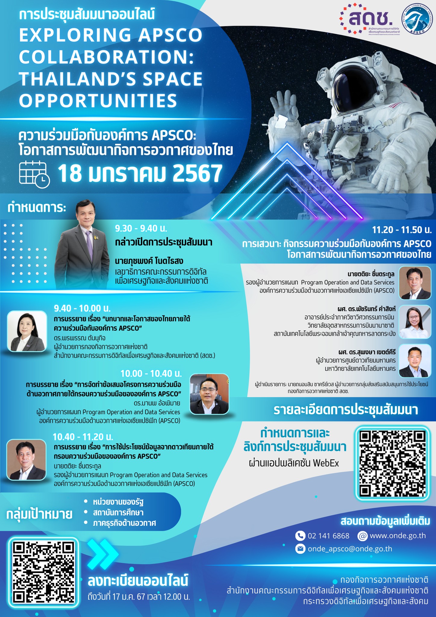 สำนักงานคณะกรรมการดิจิทัลเพื่อเศรษฐกิจและสังคมแห่งชาติ (สดช.) โดยกองกิจการอวกาศแห่งชาติ เชิญชวนผู้สนใจเข้าร่วมการประชุมสัมมนาออนไลน์ Exploring APSCO Collaboration: Thailand’s Space Opportunities “ความร่วมมือกับองค์การ APSCO : โอกาสการพัฒนากิจการอวกาศของไทย” ซึ่งจะจัดขึ้นในวันพฤหัสบดีที่ 18 มกราคม 2567 เวลา 09.30 – 12.00 น. ผ่านสื่ออิเล็กทรอนิกส์ โดยมีวัตถุประสงค์เพื่อสื่อสารให้หน่วยงานของรัฐ สถาบันการศึกษา ตลอดจนภาคธุรกิจเอกชน ได้เล็งเห็นถึงโอกาส และใช้ประโยชน์จากความร่วมมือกับองค์การ APSCO ในการพัฒนากิจการอวกาศของประเทศ ทั้งในรูปแบบของการจัดทำข้อเสนอโครงการความร่วมมือทางวิชาการ การวิจัยและพัฒนาด้านกิจการอวกาศ และการใช้ประโยชน์ข้อมูลจากดาวเทียมที่มีการแบ่งปันภายใต้แพลตฟอร์มของ APSCO อีกทั้งยังเป็นการส่งเสริมบทบาทของประเทศไทยในฐานะประธานคณะมนตรีองค์การ APSCO สำหรับวาระปี พ.ศ. 2567 – 2568 โดยการจัดการประชุมสัมมนาดังกล่าว ได้รับเกียรติจากนายภุชพงค์ โนดไธสง เลขาธิการคณะกรรมการดิจิทัลเพื่อเศรษฐกิจและสังคมแห่งชาติ เป็นประธานกล่าวเปิดการประชุมสัมมนา รวมถึงได้รับเกียรติจากวิทยากรผู้เชี่ยวชาญจากองค์การความร่วมมือด้านอวกาศแห่งเอเชียแปซิฟิก (Asia-Pacific. Space Cooperation Organization - APSCO) รวมทั้งหน่วยงานที่เกี่ยวข้องด้านอวกาศของประเทศไทยเข้าร่วมบรรยายและเสวนาในครั้งนี้ โดยมีหัวข้อในการบรรยายและการเสวนา ประกอบด้วย 1) บทบาทและโอกาสของไทยภายใต้ความร่วมมือกับองค์การ APSCO 2) การจัดทำข้อเสนอโครงการความร่วมมือด้านอวกาศภายใต้กรอบความร่วมมือขององค์การ APSCO 3)  การใช้ประโยชน์ข้อมูลจากดาวเทียมภายใต้กรอบความร่วมมือขององค์การ APSCO และ 4) กิจกรรมความร่วมมือกับองค์การ APSCO : โอกาสการพัฒนากิจการอวกาศของไทย