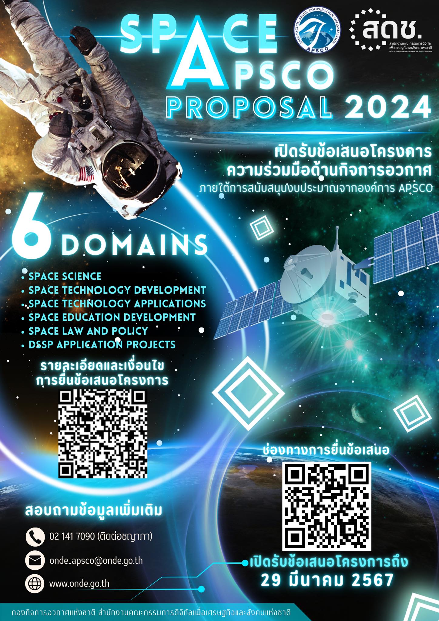 กองกิจการอวกาศแห่งชาติ สำนักงานคณะกรรมการดิจิทัลเพื่อเศรษฐกิจและสังคมแห่งชาติ (สดช.) เปิดรับข้อเสนอโครงการความร่วมมือด้านกิจการอวกาศ ภายใต้การสนับสนุนงบประมาณจากองค์การ APSCO