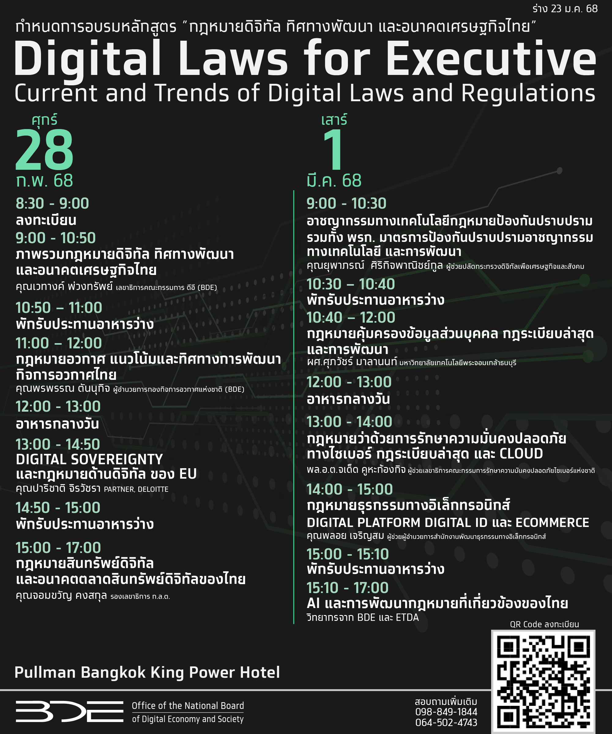 👉 BDE พร้อมแล้วที่จะถ่ายทอดความรู้ ประสบการณ์ จากวิทยากรชั้นนำของประเทศ ผู้พัฒนากฏหมาย กฏระเบียบดิจิทัล หรือมีประสบการณ์ตรงในหัวข้อที่เกี่ยวข้อง ดังนี้