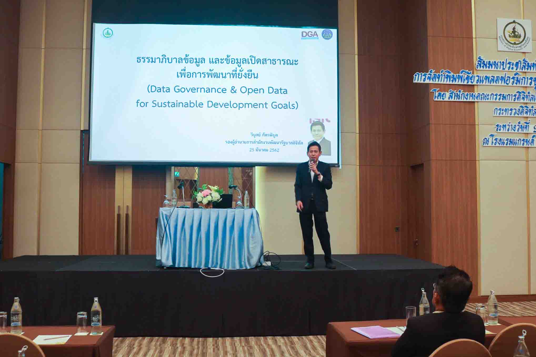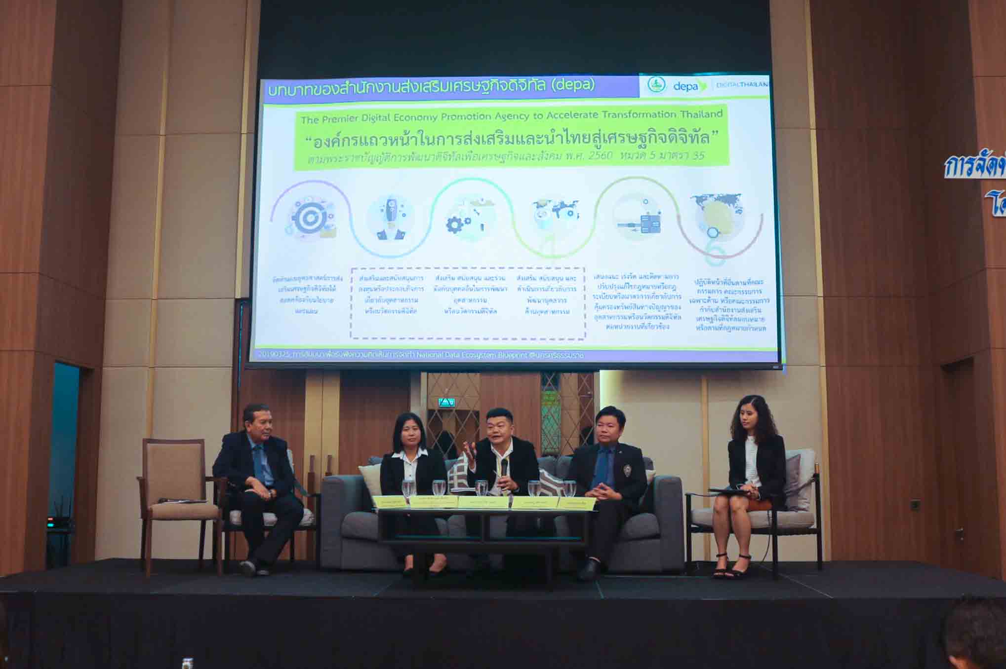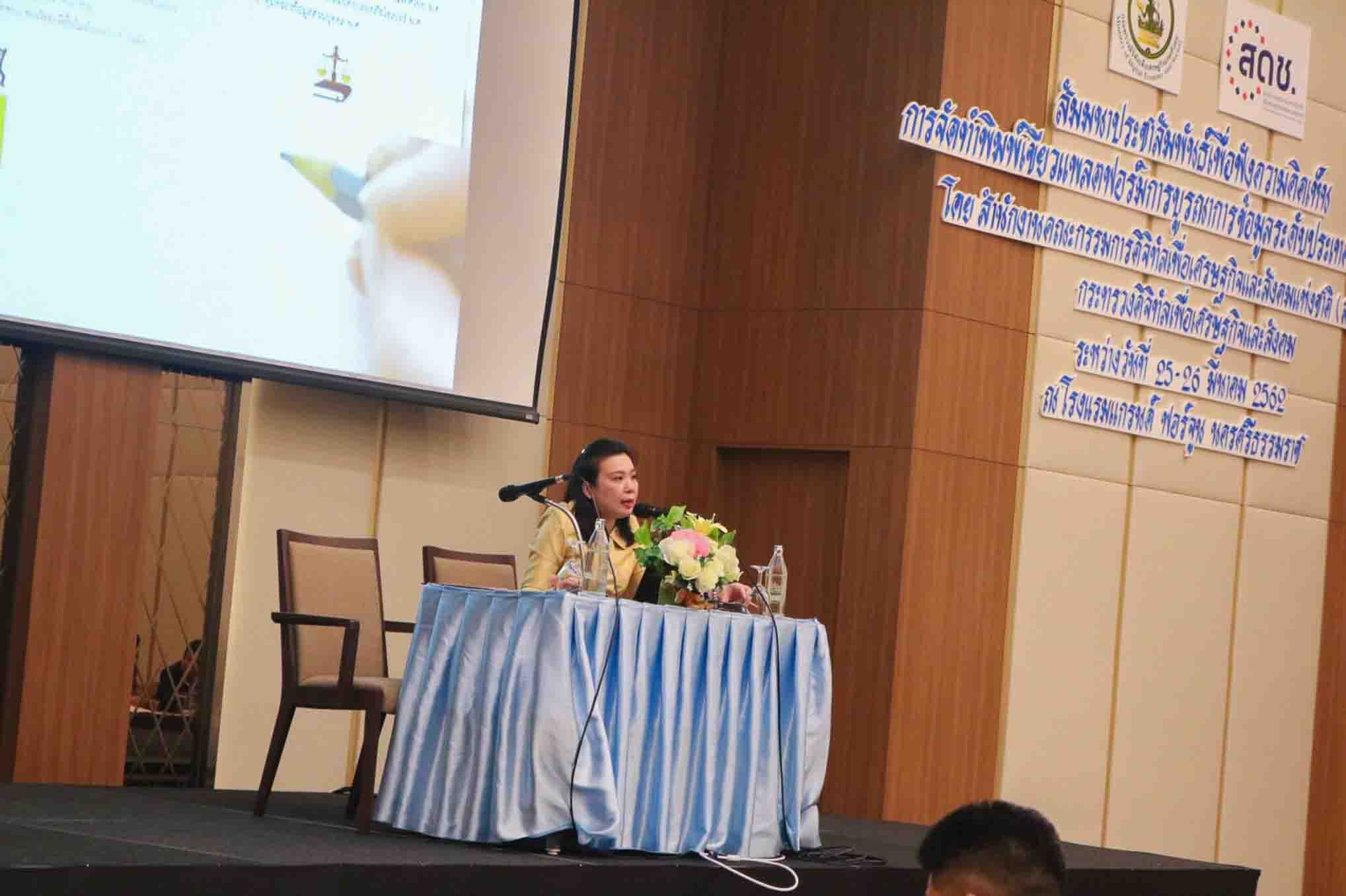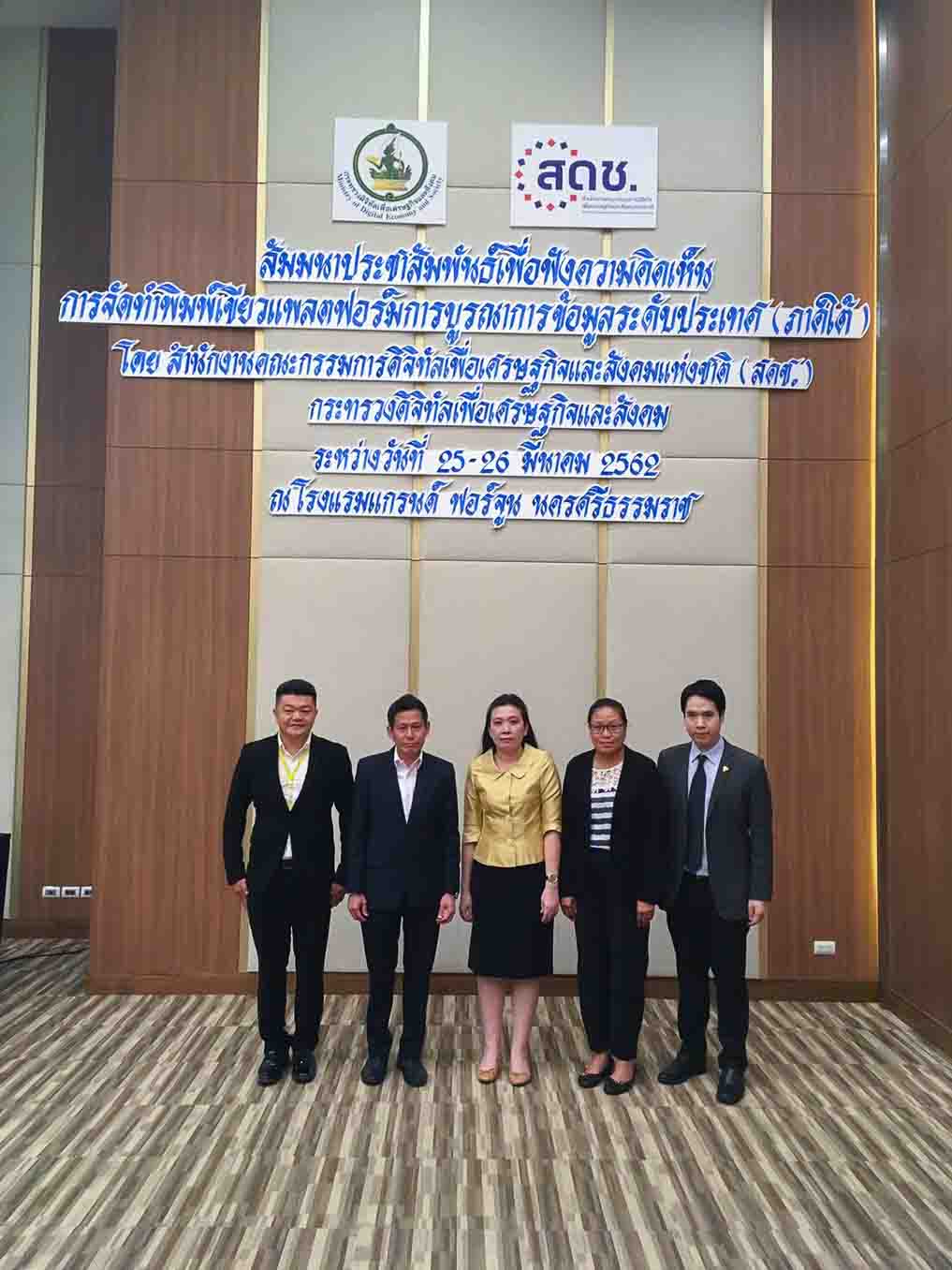 เมื่อวันที่ 25 มีนาคม 2562 นางสาวพรพรรณ ตันนุกิจ ผู้อำนวยการศูนย์พัฒนานโยบายดิจิทัลเพื่อเศรษฐกิจและสังคม สำนักงานคณะกรรมการดิจิทัลเพื่อเศรษฐกิจและสังคมแห่งชาติ เป็นประธานและกล่าวเปิดงานการสัมมนาเพื่อรับฟังความคิดเห็นการจัดทำพิมพ์เขียวแพลตฟอร์มการบูรณาการข้อมูลระดับ ประเทศ (National Data Ecosystem Blueprint) ซึ่งจัดขึ้น ณ โรงแรมแกรนด์ฟอร์จูน จังหวัดนครศรีธรรมราช ระหว่างวันที่ 25-26 มีนาคม 2562 ซึ่งเป็นการบูรณาการร่วมกันจากหลายภาคส่วนร่วมกิจกรรมในครั้งนี้ โดยได้รับเกียรติจากนายวิบูลย์ ภัทรพิบูล รองผู้อำนวยการสำนักงานพัฒนารัฐบาลดิจิทัล มาบรรยายในหัวข้อ” ธรรมาภิบาลข้อมูลและข้อมูลเปิดสาธารณะเพื่อการพัฒนาที่ยั่งยืน” นอกจากนี้ยังมีการเสวนา ในหัวข้อ”การพัฒนาเศรษฐกิจและสังคมดิจิทัลสู่ยุคไทยแลนด์ 4.0 ระดับภูมิภาค” ซึ่งมีผู้ร่วมเสวนาที่เป็นตัวแทนจากหน่วยงานทั้งภาครัฐ ภาคเอกชน ภาควิชาการในพื้นที่ ได้แก่ นายปกรณ์ ปรีชาวุฒิเดช ผู้จัดการสาขาภาคใต้ตอนล่าง สำนักงานส่งเสริมเศรษฐกิจดิจิทัล รศ.ดร.พูลพงษ์ บุญพราหมณ์ คณบดีสำนักวิชาสารสนเทศ ม.วลัยลักษณ์ นายกรกฎ เตติรานนท์ ประธานหอการค้าจังหวัดนครศรีธรรมราช และนางสาวฮาซานะฮ์ เล็กหีม ผู้อำนวยการกลุ่มวิชาการสถิติและวางแผน สำนักงานสถิติจังหวัดสุราษฎ์ธานี มาร่วมแลกเปลี่ยนมุมมองความคิดเห็นเพื่อผลักดันให้เกิดการบูรณาการ และนำไปเป็นแนวทางเพื่อขับเคลื่อนต่อไป