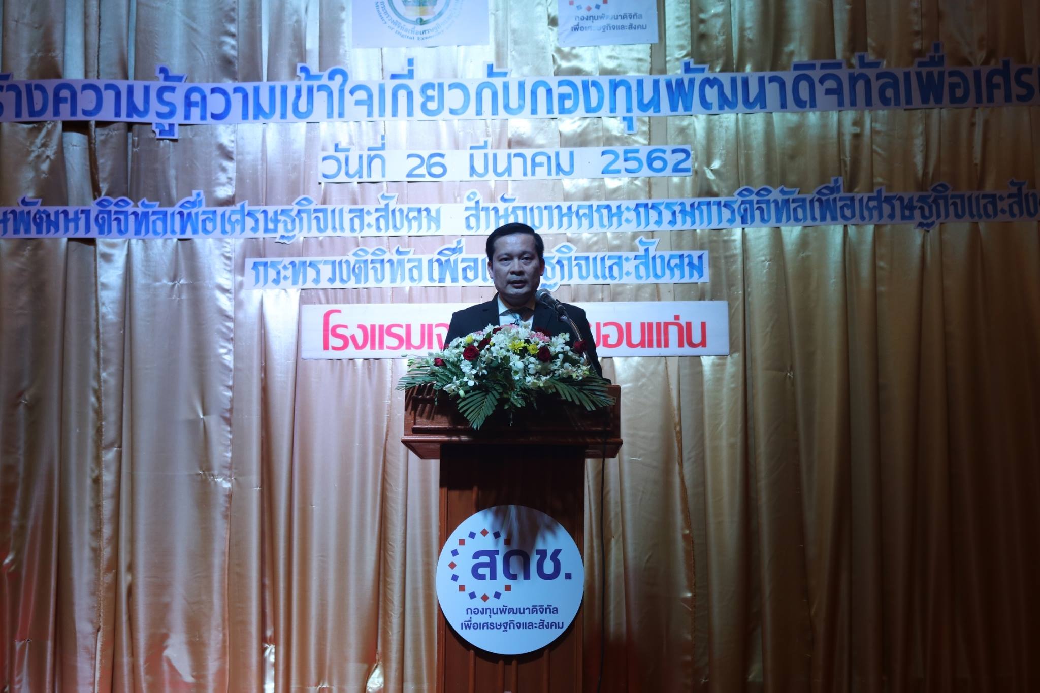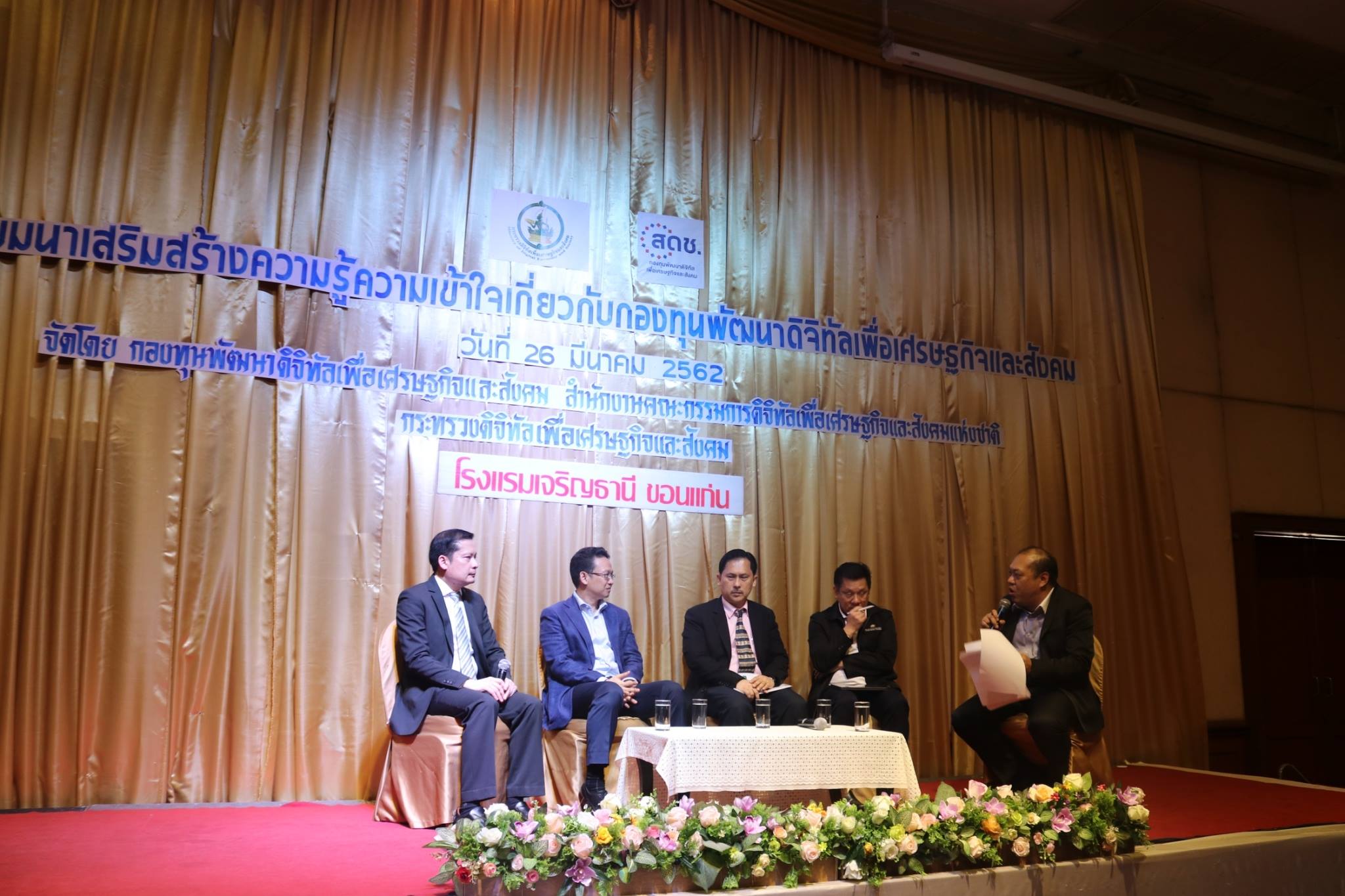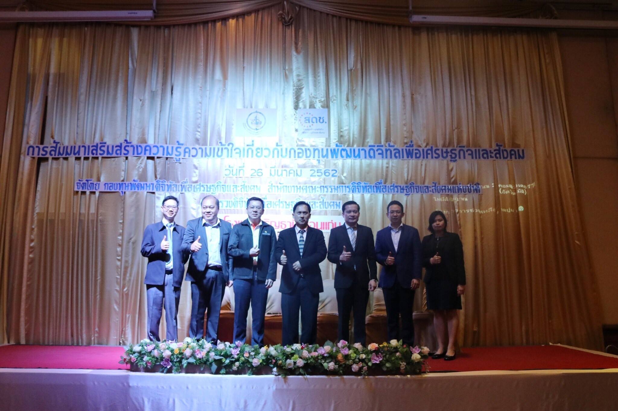 เมื่อวันที่ 26 มีนาคม 2562 กองทุนพัฒนาดิจิทัลเพื่อเศรษฐกิจและสังคม(กองทุนดีอี) สำนักงานคณะกรรมการดิจิทัลเพื่อเศรษฐกิจและสังคมแห่งชาติ (สดช.) ได้จัดสัมมนาเสริมสร้างความรู้ ความเข้าใจเกี่ยวกับกองทุนพัฒนาดิจิทัลเพื่อเศรษฐกิจและสังคม ครั้งที่ 2/2562 ณ โรงแรมเจริญธานี จังหวัดขอนแก่น โดยมีนายธเนศ วิริยะจิตต์ ผู้อำนวยการกองบริหารกองทุนพัฒนาดิจิทัลเพื่อเศรษฐกิจและสังคม เป็นประธานในพิธีเปิดการสัมมนาในประเด็นเรื่อง “กองทุนพัฒนาดิจิทัลเพื่อเศรษฐกิจและสังคม ภายใต้สำนักงานคณะกรรมการดิจิทัลเพื่อเศรษฐกิจและสังคมแห่งชาติกับการพัฒนาประเทศและแนวทางการขอรับทุน” นอกจากนี้ ยังมีเวทีเสวนากองทุนดีอี โอกาสของการพัฒนาประเทศด้วยเทคโนโลยีดิจิทัลในมือคุณและตอบคำถามในช่วงคลินิกกองทุน โดย มีผู้ร่วมเสวนาประกอบด้วย ผู้อำนวยการกองบริหารกองทุนพัฒนาดิจิทัลเพื่อเศรษฐกิจและสังคม, ผู้ช่วยผู้อำนวยการอาวุโสสำนักงานส่งเสริมเศรษฐกิจดิจิทัล (depa) และเจ้าหน้าที่กองบริหารกองทุนพัฒนาดิจิทัลเพื่อเศรษฐกิจและสังคม ทั้งนี้ยังมีช่วงคลินิกกองทุนให้สำหรับผู้ที่มีข้อสงสัยร่วมกันซักถาม โดย เจ้าหน้าที่กองบริหารกองทุนพัฒนาดิจิทัลเพื่อเศรษฐกิจและสังคม