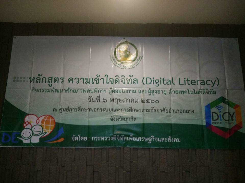 สำนักงานคณะกรรมการดิจิทัลเพื่อเศรษฐกิจและสังคมแห่งชาติ (สดช.) จัดอบรมหลักสูตรความเข้าใจดิจิทัล (Digital Literacy) กิจกรรมพัฒนาศักยภาพคนพิการ ผู้ด้อยโอกาสและผู้สูงอายุ ด้วยเทคโนโลยีดิจิทัล ณ ศูนย์การศึกษานอกระบบและการศึกษาตามอัธยาศัย อำเภอถลาง จังหวัดภูเก็ต เมื่อวันที่ 6 พฤษภาคม 2560