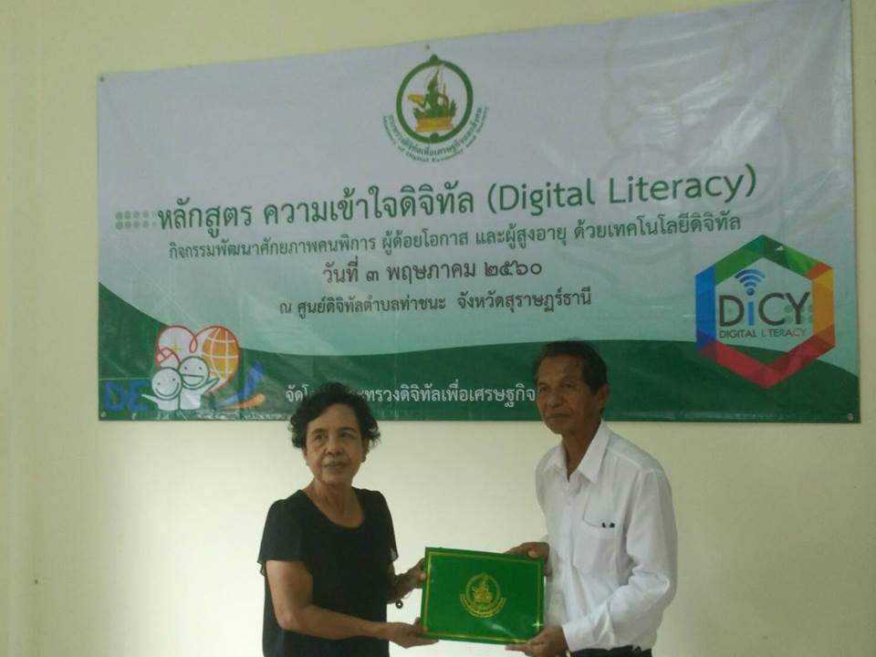 สำนักงานคณะกรรมการดิจิทัลเพื่อเศรษฐกิจและสังคม (สดช.) จัดกิจกรรมพัฒนาศักยภาพคนพิการ ผู้ด้อยโอกาส และผู้สูงอายุ ด้วยเทคโนโลยีดิจิทัล หลักสูตร  ความเข้าใจดิจิทัล (Digital Literacy) เพื่อให้ใช้เทคโนโลยีดิจิทัลได้อย่างถูกต้อง ณ ศูนย์ดิจิทัลตำบลท่าชนะ อำเภอท่าชนะ จังหวัดสุราษฎร์ธานี เมื่อวันที่ 3 พ.ค. 60 โดยมีนางละอองดาว คมสันต์ สถิติจังหวัดสุราษฎร์ธานี ให้เกียรติเป็นประธานเปิดกิจกรรม ดังกล่าว