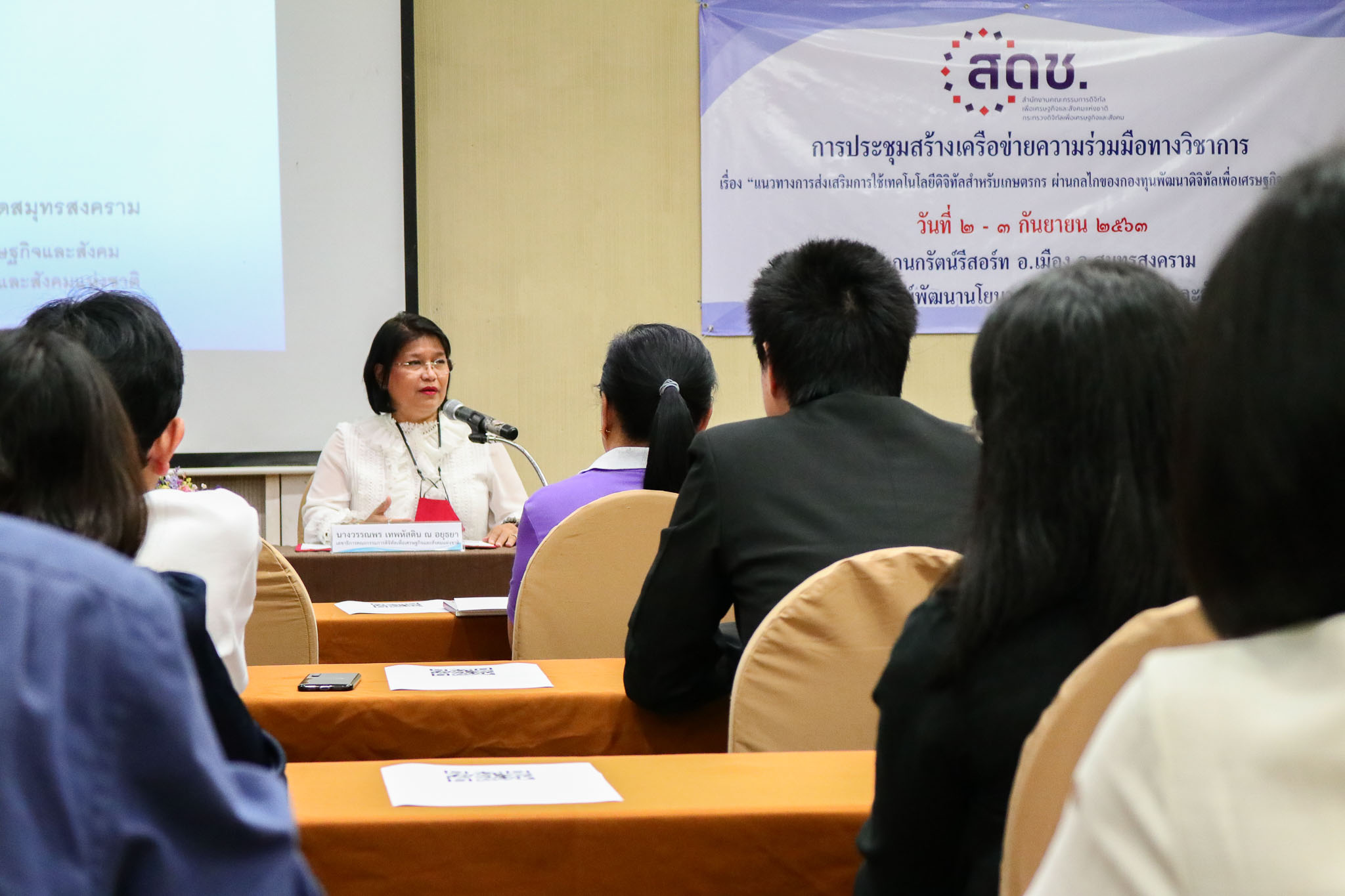 นางวรรณพร เทพหัสดิน ณ อยุธยา เลขาธิการคณะกรรมการดิจิทัลเพื่อเศรษฐกิจและสังคมแห่งชาติ เป็นประธานเปิดการประชุมสร้างเครือข่ายความร่วมมือทางวิชาการ เรื่องแนวทางการส่งเสริมการใช้เทคโนโลยีดิจิทัลสำหรับเกษตรกรผ่านกลไกของกองทุนพัฒนาดิจิทัลเพื่อเศรษฐกิจและสังคม วันที่ 2 – 3 กันยายน 2563 ณ กนกรัตน์รีสอร์ท อ.เมือง จ.สมุทรสงคราม