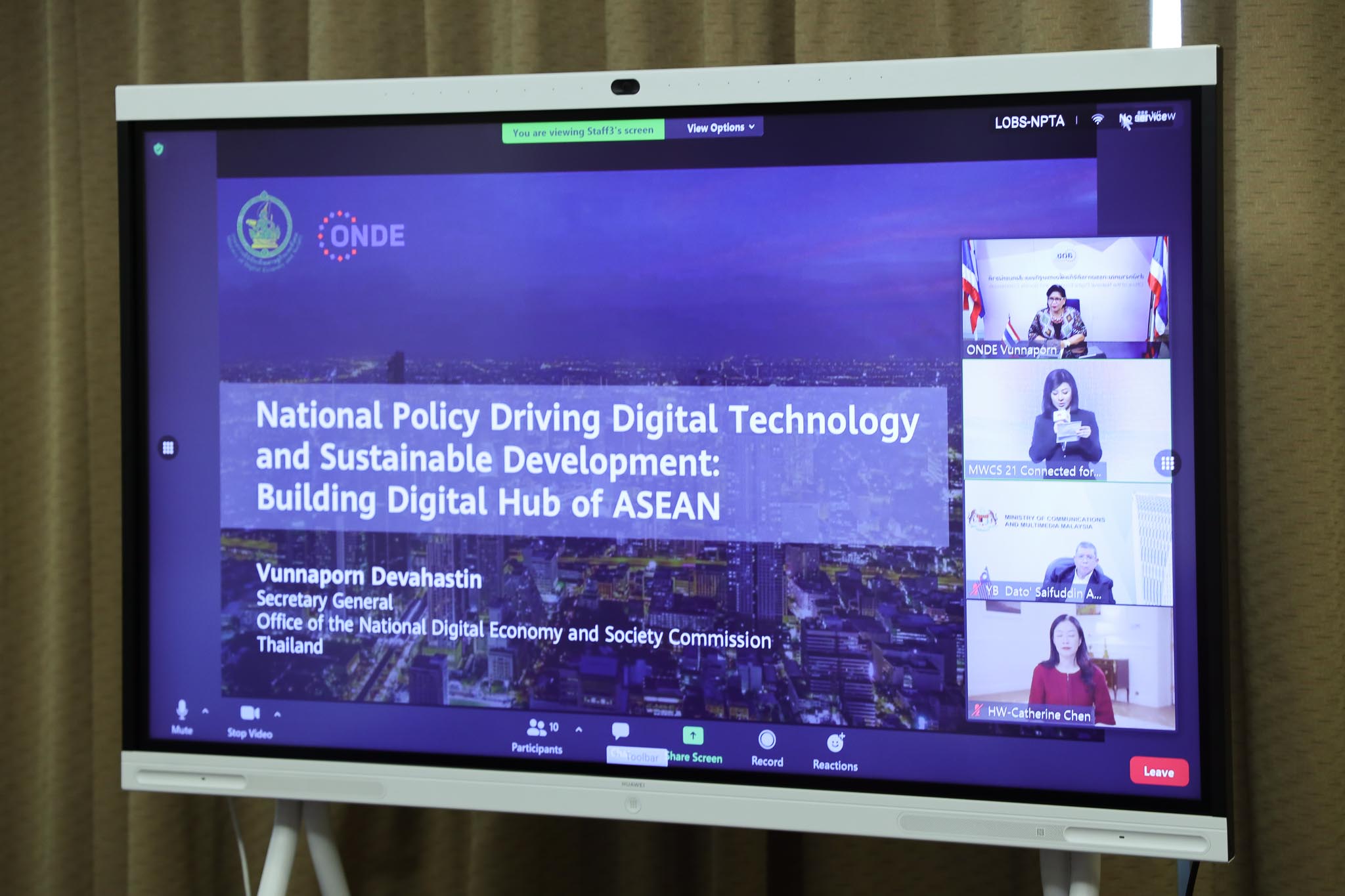 โดยนางวรรณพร เทพหัสดิน ณ อยุธยา เลขาธิการคณะกรรมการดิจิทัลเพื่อเศรษฐกิจและสังคมแห่งชาติ เป็นผู้แทนของประเทศไทยกล่าวสุนทรพจน์ในหัวข้อ “แผนการขับเคลื่อนการผลักดันเทคโนโลยีดิจิทัลและการพัฒนาอย่างยั่งยืน: การสร้างศูนย์กลางด้านดิจิทัลแห่งอาเซียน (National Policy on Digital Technology and Sustainable Development: Building Digital Hub of ASEAN)” งานสัมมนาดังกล่าวจัดขึ้นในรูปแบบออนไลน์ภายใต้หัวข้อ “การเชื่อมต่อเพื่อการเติบโตร่วมกัน” (Connected for Shared Prosperity) ซึ่งเป็นส่วนหนึ่งของงาน MWC Shanghai 2021 ร่วมกับตัวแทนจากองค์กรภาครัฐหลากหลายประเทศ พร้อมเผยแพร่นโยบายในการวางรากฐานให้ประเทศไทยก้าวขึ้นสู่การเป็นศูนย์กลางด้านดิจิทัลแห่งอาเซียน ตามวิสัยทัศน์ของการเร่งเติบโตด้านเศรษฐกิจ การพัฒนาคุณภาพทางสังคม และการพัฒนาอย่างยั่งยืน ซึ่งจะเป็นโอกาสให้ประเทศไทยพัฒนาไปสู่การเป็นผู้นำด้านดิจิทัลเพื่ออนาคตที่ดียิ่งขึ้น