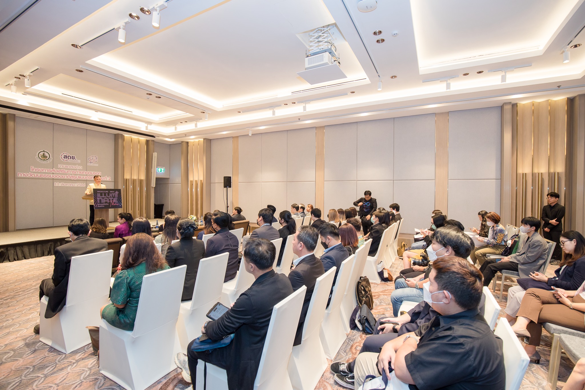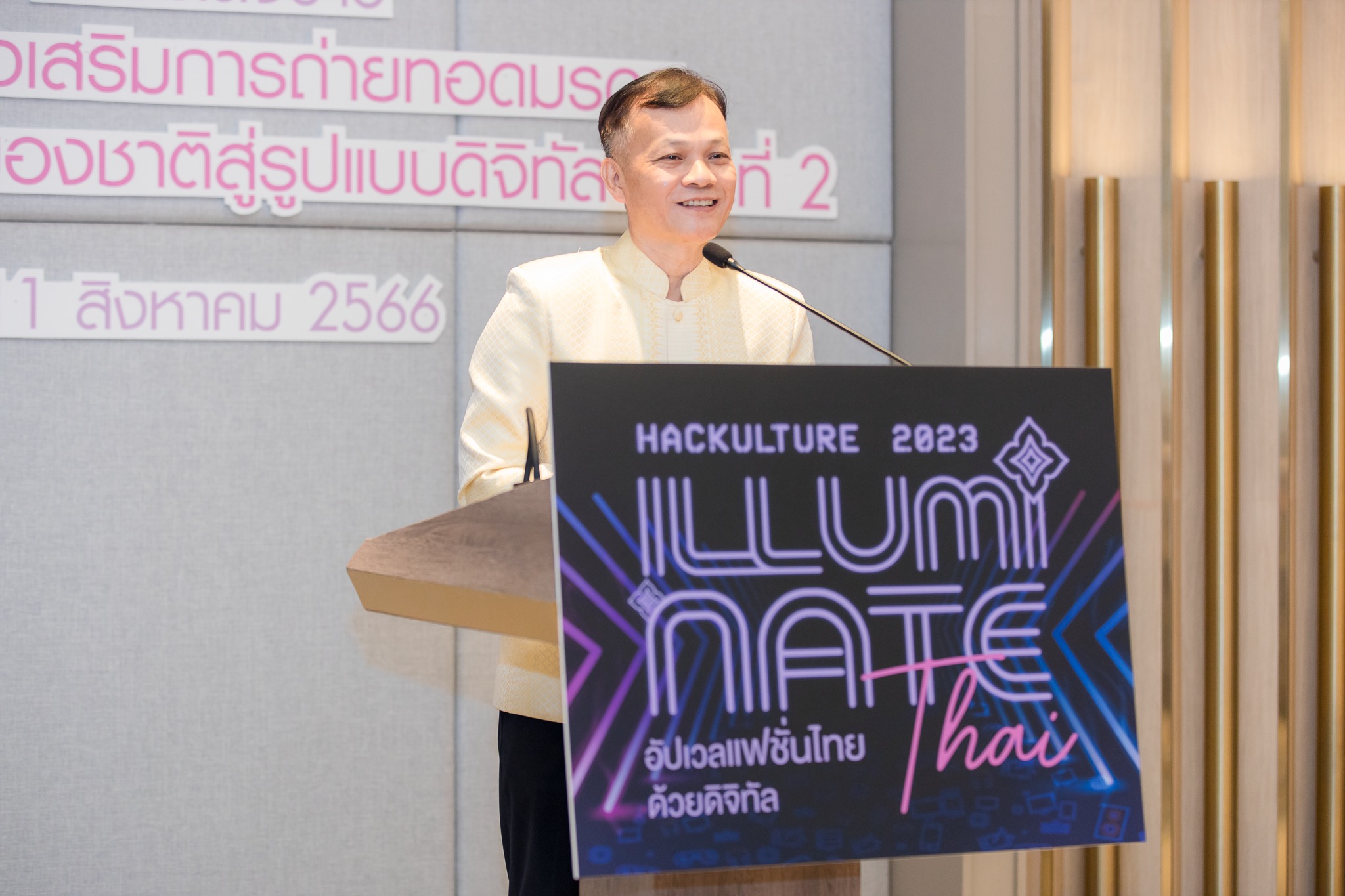 วันนี้ (11 สิงหาคม 2566) นายภุชพงค์ โนดไธสง เลขาธิการคณะกรรมการดิจิทัลเพื่อเศรษฐกิจและสังคมแห่งชาติ เป็นประธานเปิดตัวงานแถลงข่าว “โครงการส่งเสริมการถ่ายทอดมรดกทางวัฒนธรรมของชาติสู่รูปแบบดิจิทัล” หรือ “Digital Cultural Heritage ระยะที่ 2” กิจกรรมแข่งขันเชิงสร้างสรรค์ “Hackulture 2023 illuminate Thai อัปเวลแฟชั่นไทย ด้วยดิจิทัล” เพื่อเชิญชวนเยาวชนและประชาชนทั่วไป ประชันไอเดียช่วยกันแฮกแฟชั่นไทยด้วยวัฒนธรรมและดิจิทัลคอนเทนต์ ปลุกพลัง Soft Power ไทย ชิงเงินรางวัลรวมกว่า 400,000 บาท พร้อมสร้างโอกาสในการนำเสนอผลงานต่อผู้บริหารองค์กรทางด้านดิจิทัลชั้นนำของประเทศไทย โดยทีมที่ผ่านรอบคัดเลือกทุกทีมจะได้รับทุน “Smart Skills” หลักสูตร E-Learning เพื่อส่งเสริมการพัฒนาทักษะด้านดิจิทัลที่ได้รับการยอมรับจากบริษัทดิจิทัลชั้นนำระดับโลก ซึ่งมอบให้กับสมาชิกทุกคนที่ผ่านการคัดเลือกรอบแรก โดยมีนายธีรวุฒิ ธงภักดิ์ รองเลขาคณะกรรมการดิจิทัลเพื่อเศรษฐกิจและสังคมแห่งชาติ พร้อมด้วยผู้บริหาร ข้าราชการ และสำนักงานคณะกรรมการดิจิทัลเพื่อเศรษฐกิจและสังคมแห่งชาติ เข้าร่วม ณ โรงแรมอัศวิน แกรนด์ คอนเวนชั่น เขตหลักสี่ กรุงเทพฯ