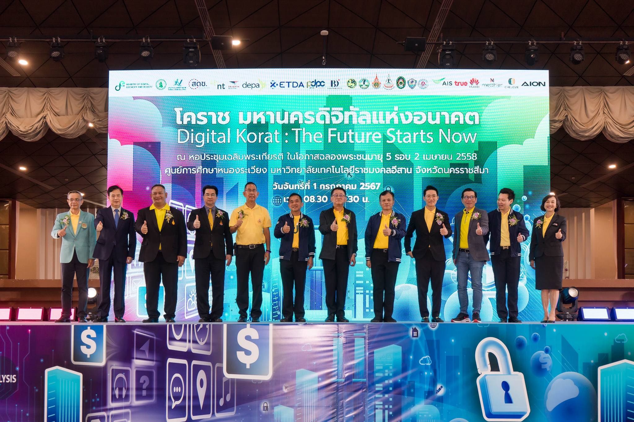 วันนี้ (1 กรกฎาคม 2567) นายภุชพงค์ โนดไธสง เลขาธิการคณะกรรมการดิจิทัลเพื่อเศรษฐกิจและสังคมแห่งชาติ พร้อมด้วยผู้ช่วยศาสตราจารย์ ดร. ณัฐพล นิมมานพัชรินทร์ ผู้อำนวยการใหญ่สำนักงานส่งเสริมเศรษฐกิจดิจิทัล รองศาสตราจารย์ ดร. โฆษิต ศรีภูธร อธิการบดีมหาวิทยาลัยเทคโนโลยีราชมงคลอีสาน รองศาสตราจารย์ ดร. อนันต์ ทองระอา อธิการบดีมหาวิทยาลัยเทคโนโลยีสุรนารี และรองศาสตราจารย์ ดร. อดิศร เนาวนนท์ อธิการบดีมหาวิทยาลัยราชภัฏนครราชสีมา ร่วมลงนามบันทึกข้อตกลงความร่วมมือ (MOU) ว่าด้วยความร่วมมือด้านการพัฒนากำลังคนดิจิทัล ระหว่างสำนักงานคณะกรรมการดิจิทัลเพื่อเศรษฐกิจและสังคมแห่งชาติ (สดช.) สำนักงานส่งเสริมเศรษฐกิจดิจิทัล (depa) มหาวิทยาลัยเทคโนโลยีราชมงคลอีสาน มหาวิทยาลัยเทคโนโลยีสุรนารี และมหาวิทยาลัยราชภัฏนครราชสีมา โดยมีนายประเสริฐ จันทรรวงทอง รัฐมนตรีว่าการกระทรวงดิจิทัลเพื่อเศรษฐกิจและสังคม ร่วมเป็นสักขีพยาน ณ หอประชุมเฉลิมพระเกียรติ ในโอกาสฉลองพระชนมายุ 5 รอบ 2 เมษายน 2558 ศูนย์การศึกษาหนองระเวียง มหาวิทยาลัยเทคโนโลยีราชมงคลอีสาน จังหวัดนครราชสีมา