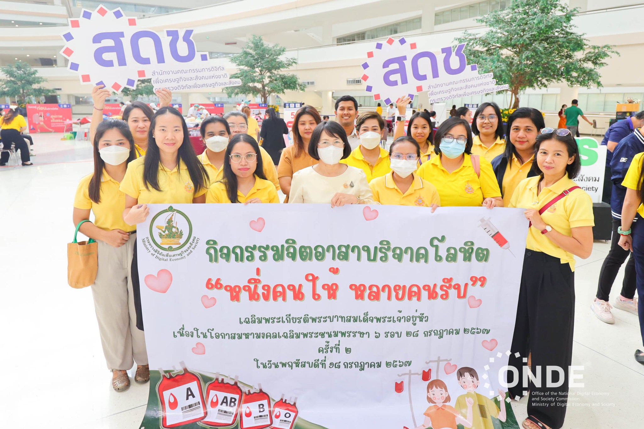 วันนี้ (18 กรกฎาคม 2567) นางอำไพ จิตรแจ่มใส รองเลขาธิการคณะกรรมการดิจิทัลเพื่อเศรษฐกิจและสังคมแห่งชาติ พร้อมด้วยข้าราชการ พนักงานราชการ และเจ้าหน้าที่สำนักงานคณะกรรมการดิจิทัลเพื่อเศรษฐกิจและสังคมแห่งชาติ (สดช.) เข้าร่วมกิจกรรมจิตอาสาบริจาคโลหิต “หนึ่งคนให้ หลายคนรับ” เฉลิมพระเกียรติพระบาทสมเด็จพระเจ้าอยู่หัว เนื่องในโอกาสมหามงคลเฉลิมพระชนมพรรษา 6 รอบ 28 กรกฎาคม 2567 ครั้งที่ 2 โดยมีนายเวทางค์ พ่วงทรัพย์ รองปลัดกระทรวงดิจิทัลเพื่อเศรษฐกิจและสังคม เป็นประธานเปิดกิจกรรมฯ ณ ลานอเนกประสงค์ ชั้น 2 อาคารรัฐประศาสนภักดี ศูนย์ราชการเฉลิมพระเกียรติฯ กรุงเทพฯ