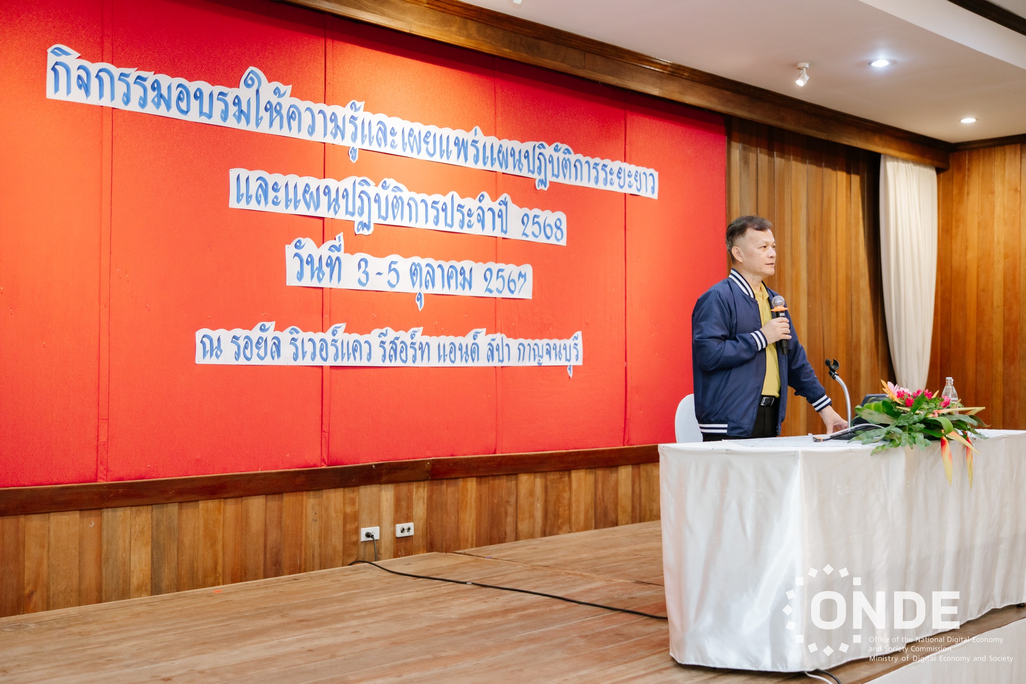 วันนี้ (3 ตุลาคม 2567) นายภุชพงค์ โนดไธสง เลขาธิการคณะกรรมการดิจิทัลเพื่อเศรษฐกิจและสังคมแห่งชาติ เป็นประธานเปิดกิจกรรมอบรมให้ความรู้และเผยแพร่แผนปฏิบัติการระยะยาวและแผนปฏิบัติการ ประจำปี 2568 พร้อมด้วย นายสมเกียรติ ศิริวัฒนโชค ผู้เชี่ยวชาญเฉพาะด้านการบริหารจัดการเชิงนโยบาย นายสมบูรณ์ เมฆไพบูลย์วัฒนา ผู้เชี่ยวชาญเฉพาะด้านการบริหารเทคโนโลยีดิจิทัลและการสื่อสาร สำนักงานคณะกรรมการดิจิทัลเพื่อเศรษฐกิจและสังคมแห่งชาติ (สดช.) และนายวิริยะ มงคลวีราพันธ์ ที่ปรึกษาเลขาธิการคณะกรรมการดิจิทัลเพื่อเศรษฐกิจและสังคมแห่งชาติ โดยมีนางสาววรรณศิริ พัวศิริ ผู้อำนวยการกองบริหารกองทุนพัฒนาดิจิทัลเพื่อเศรษฐกิจและสังคม สดช. กล่าวรายงาน ตลอดจนผู้บริหาร ข้าราชการ พนักงานราชการ และบุคลากรของ สดช. เข้าร่วมกิจกรรมอบรมฯ ซึ่งจัดขึ้นระหว่างวันที่ 3 - 5 ตุลาคม 2567 ณ โรงแรมรอยัล ริเวอร์แคว รีสอร์ท แอนด์สปา จ.กาญจนบุรี