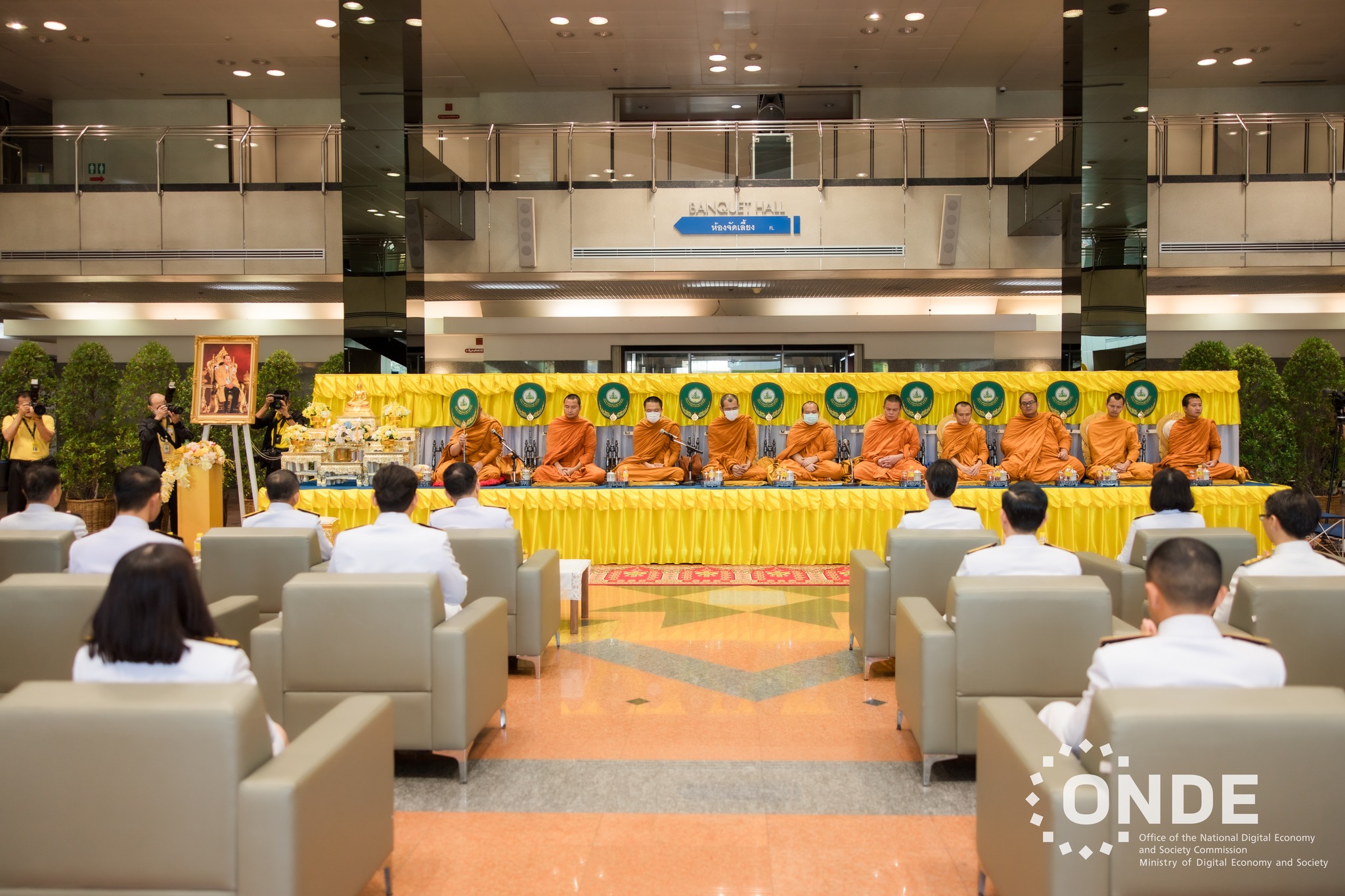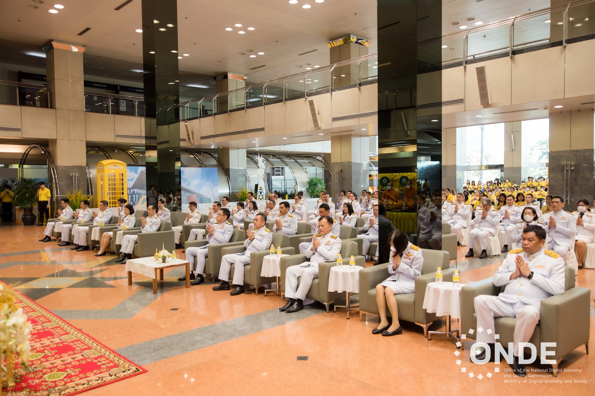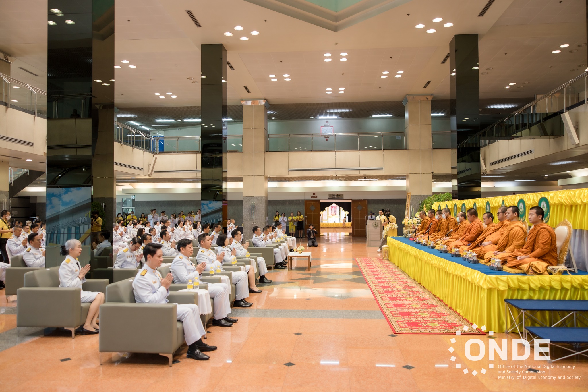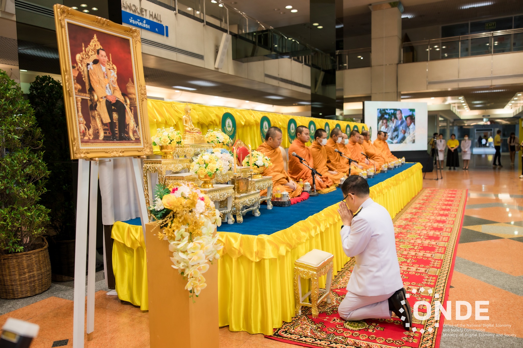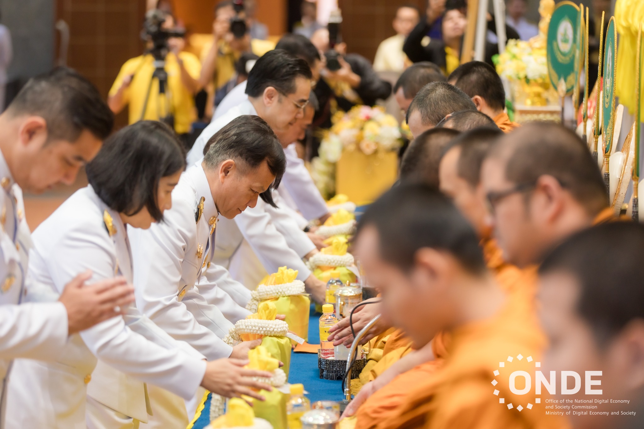 วันนี้ (15 ตุลาคม 2567) นายประเสริฐ จันทรรวงทอง รองนายกรัฐมนตรี และรัฐมนตรีว่าการกระทรวงดิจิทัลเพื่อเศรษฐกิจและสังคม เป็นประธานในพิธีตักบาตร แด่พระสงฆ์ 10 รูป และพิธีสวดพระพุทธมนต์ถวายพระราชกุศล พระบาทสมเด็จพระบรมชนกาธิเบศร มหาภูมิพลอดุลยเดชมหาราช บรมนาถบพิตร เนื่องในวันนวมินทรมหาราช 13 ตุลาคม 2567 โดยมีศาสตราจารย์พิเศษวิศิษฏ์ วิศิษฏ์สรอรรถ ปลัดกระทรวงดิจิทัลเพื่อเศรษฐกิจและสังคม พร้อมด้วยนายภุชพงค์ โนดไธสง เลขาธิการคณะกรรมการดิจิทัลเพื่อเศรษฐกิจและสังคมแห่งชาติ นายธีรวุฒิ ธงภักดิ์ รองเลขาธิการคณะกรรมการดิจิทัลเพื่อเศรษฐกิจและสังคมแห่งชาติ และนางอำไพ จิตรแจ่มใส รองเลขาธิการคณะกรรมการดิจิทัลเพื่อเศรษฐกิจและสังคมแห่งชาติ ตลอดจนผู้บริหาร ข้าราชการ และเจ้าหน้าที่สำนักงานคณะกรรมการดิจิทัลเพื่อเศรษฐกิจและสังคมแห่งชาติ (สดช.) และหน่วยงานในสังกัดกระทรวงดิจิทัลเพื่อเศรษฐกิจและสังคม เข้าร่วมพิธี ณ บริเวณโถงชั้น 1 อาคาร 9 บริษัท โทรคมนาคมแห่งชาติ จำกัด (มหาชน) กรุงเทพฯ
