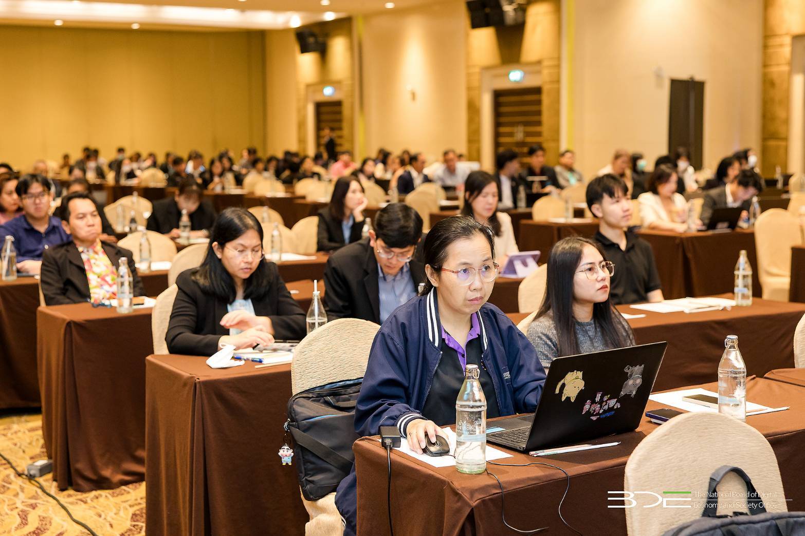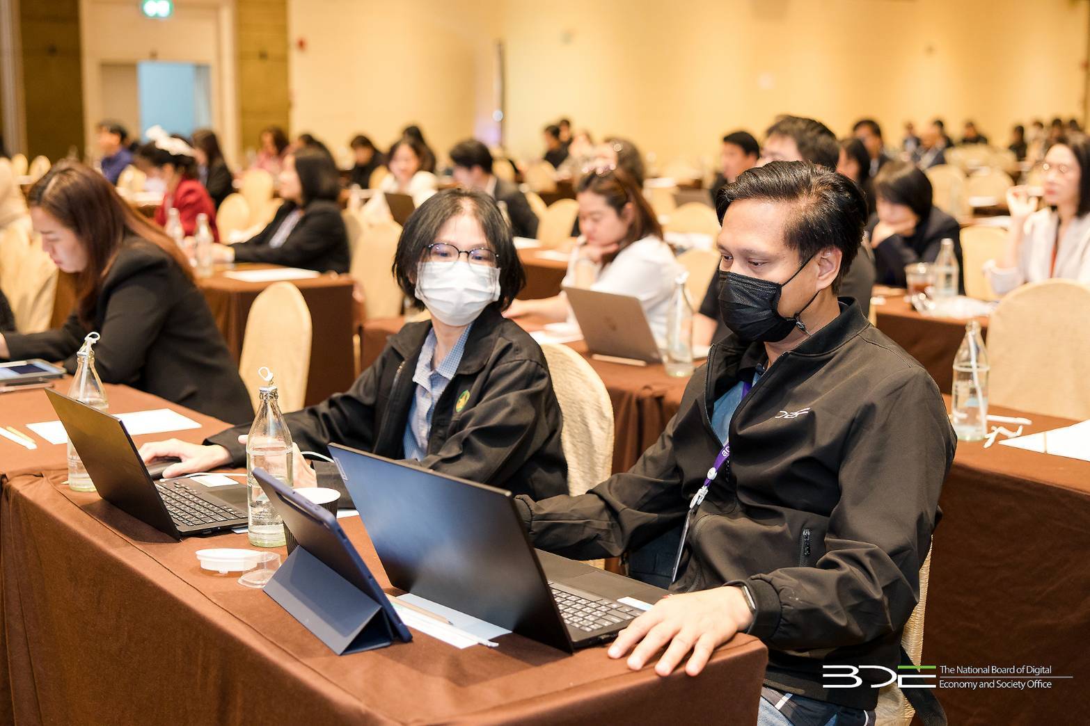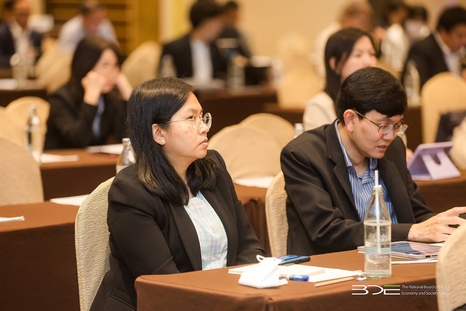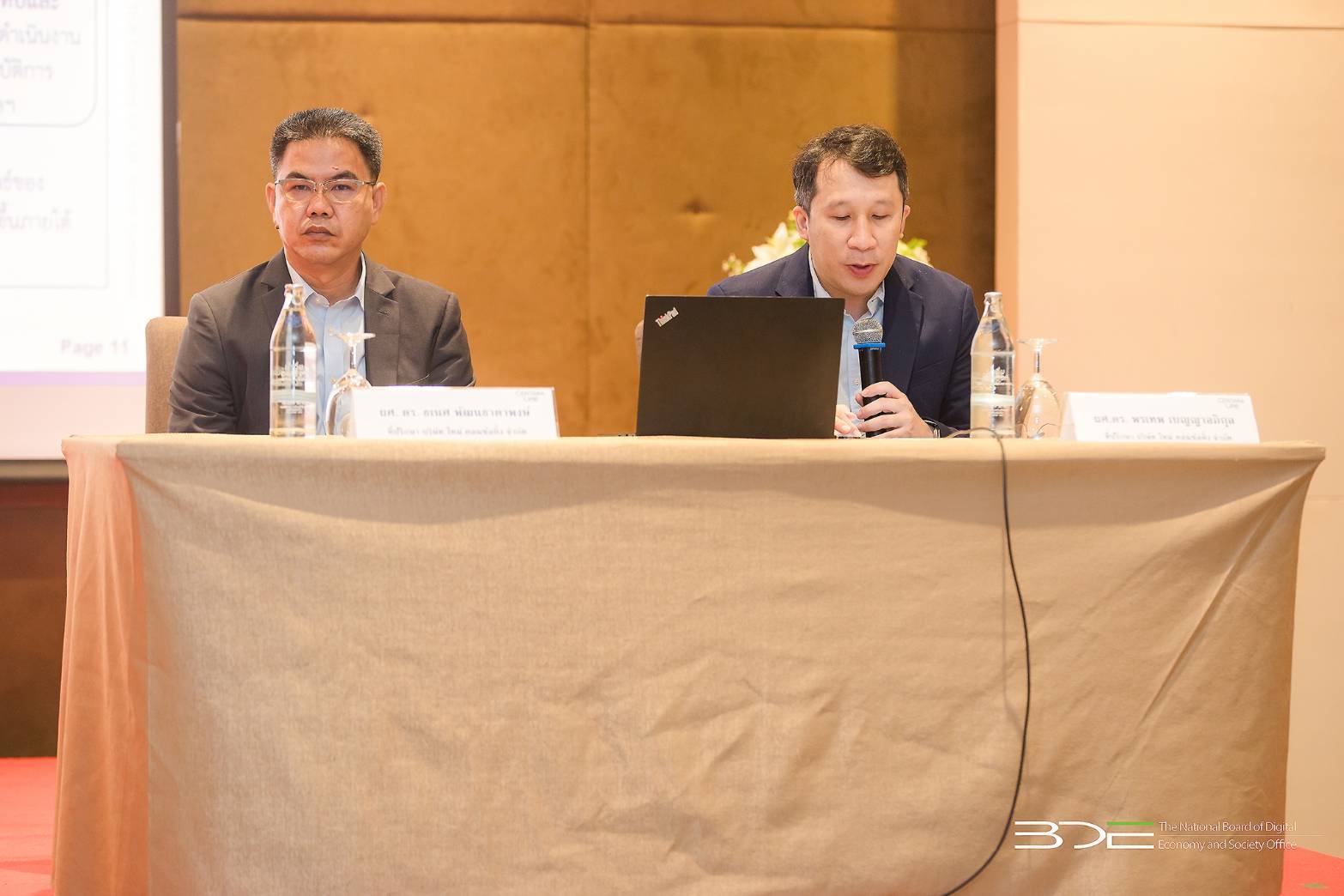 นายเวทางค์ พ่วงทรัพย์ เลขาธิการ BDE กล่าวว่า การประชุมสัมมนาในวันนี้ ถือเป็นโอกาสสำคัญที่จะได้รับทราบข้อมูล สถานะปัจจุบันของการพัฒนาด้านดิจิทัลของประเทศไทย รวมทั้งกรอบแนวทางการติดตามและประเมินผลการดำเนินงานตามนโยบายและแผนระดับชาติว่าด้วยการพัฒนาดิจิทัลเพื่อเศรษฐกิจและสังคม ตลอดจนผลกระทบและประโยชน์ของนโยบายและแผนดีอี รวมถึงข้อเสนอแนะในการขับเคลื่อนการพัฒนาดิจิทัลเพื่อเศรษฐกิจและสังคม ซึ่งเป็นผลจากการรวบรวมและรับฟังความคิดเห็นจากหน่วยงานภาครัฐ ภาคเอกชน และภาคประชาชน ผ่านการประชุมเชิงปฏิบัติการ (Focus Group) ทั้งในส่วนกลางและส่วนภูมิภาค รวมทั้งสิ้น 5 จังหวัด ได้แก่ กรุงเทพมหานคร ชลบุรี ขอนแก่น สงขลา และเชียงใหม่ จากการติดตามและประเมินผลนโยบายและแผนดีอี (พ.ศ. 2561 – 2580) ซึ่งประกอบด้วย 6 ยุทธศาสตร์ 4 เป้าหมาย 6 ตัวชี้วัด โดย BDE ได้ร่วมผลักดันให้ตัวชี้วัดเหล่านี้ประสบความสำเร็จแล้ว