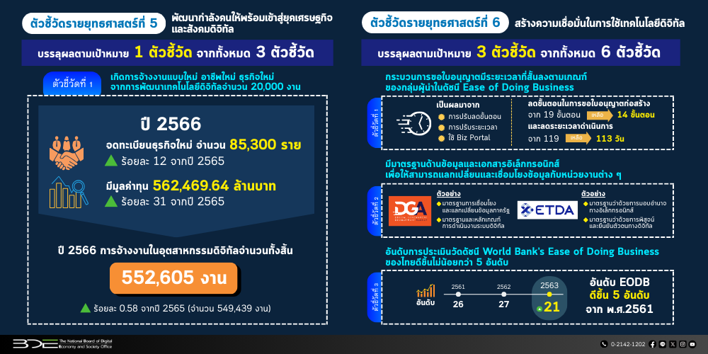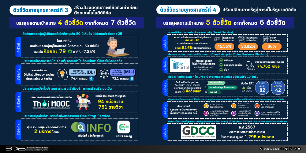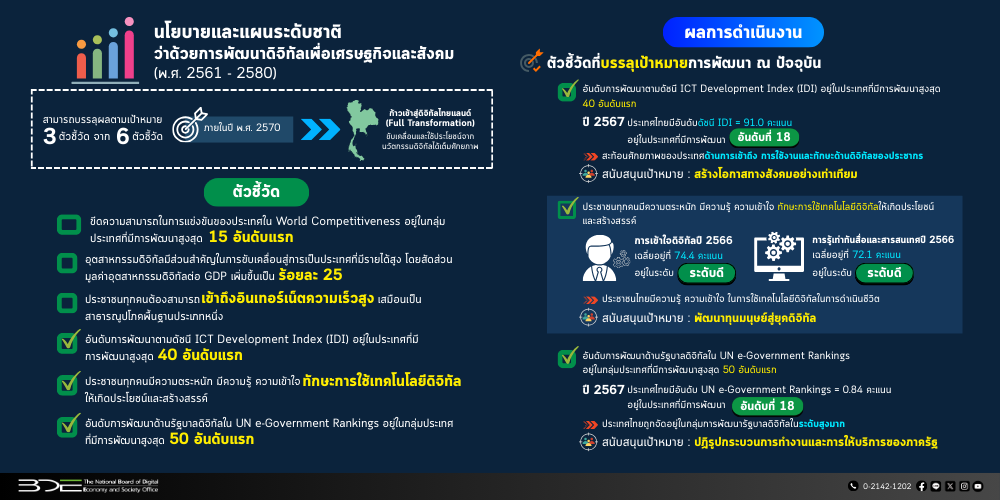 ทั้งนี้ ผลการติดตามและประเมินผลการดำเนินงานตามนโยบายและแผนระดับชาติว่าด้วยการพัฒนาดิจิทัลเพื่อเศรษฐกิจและสังคม (พ.ศ. 2561-2580) เมื่อแบ่งตามรายยุทธศาสตร์ ทั้ง 6 ด้าน พบว่า 3 ใน 6 สามารถผ่านตัวชี้วัดได้เกินกว่าครึ่ง