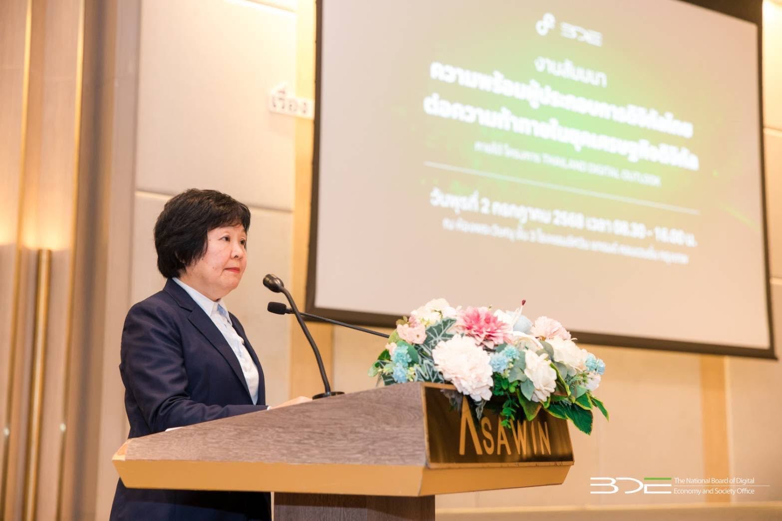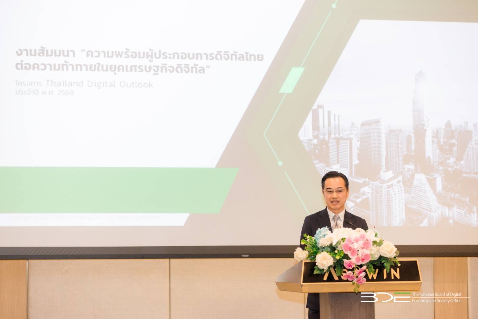 วันนี้ (2 กรกฎาคม 2568) นายเวทางค์ พ่วงทรัพย์ เลขาธิการคณะกรรมการดิจิทัลเพื่อเศรษฐกิจและสังคมแห่งชาติ (BDE) เป็นประธานเปิดงานสัมมนา “ความพร้อมผู้ประกอบการดิจิทัลไทยต่อความท้าทายในยุคเศรษฐกิจดิจิทัล” ภายใต้โครงการ Thailand Digital Outlook และปาฐกถาพิเศษ ในหัวข้อ “แนวโน้มเศรษฐกิจดิจิทัล ปี 2568 และความพร้อมผู้ประกอบการดิจิทัลไทย” โดยมีผู้บริหารจากหน่วยงานภาครัฐ ภาคเอกชน และภาควิชาการ เข้าร่วมงาน ณ โรงแรมอัศวิน แกรนด์ คอนเวนชั่น กรุงเทพฯ