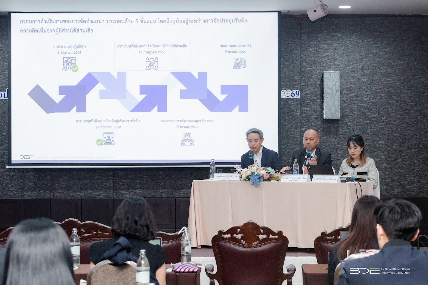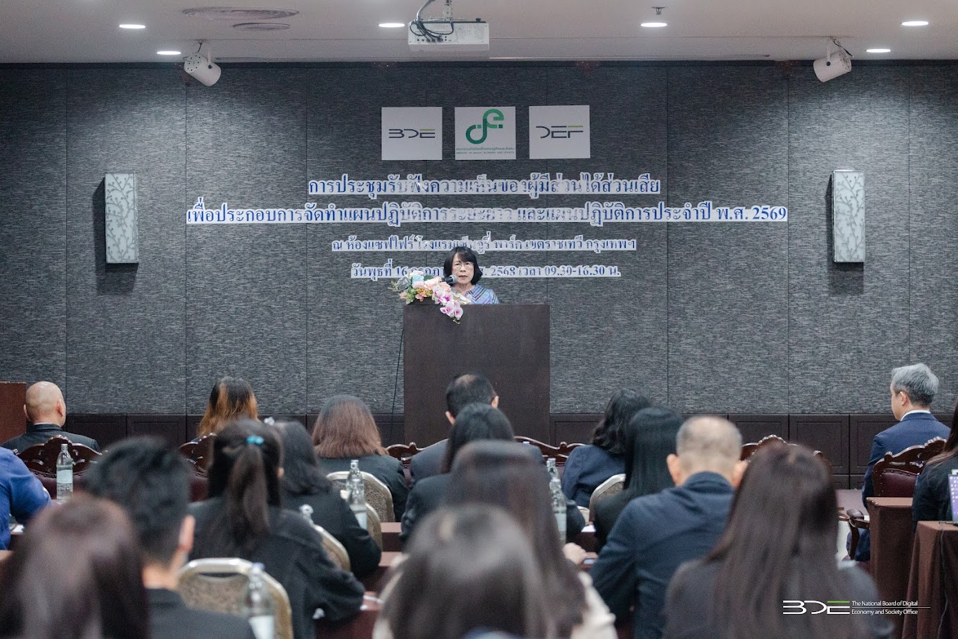 วันนี้ (16 กรกฎาคม 2568) นางอำไพ จิตรแจ่มใส รองเลขาธิการคณะกรรมการดิจิทัลเพื่อเศรษฐกิจและสังคมแห่งชาติ (BDE) เป็นประธานการประชุมรับฟังความเห็นของผู้มีส่วนได้ส่วนเสีย เพื่อประกอบการจัดทำแผนปฏิบัติการระยะยาวและแผนปฏิบัติการประจำปี พ.ศ. 2569 พร้อมด้วยนางสาววรรณศิริ พัวศิริ ผู้อำนวยการกองบริหารกองทุนพัฒนาดิจิทัลเพื่อเศรษฐกิจและสังคม (กองทุนดีอี) และนางพุทธรักษา แดงรัตน์ ผู้อำนวยการสำนักงานเลขาธิการ สำนักงานคณะกรรมการดิจิทัลเพื่อเศรษฐกิจและสังคมแห่งชาติ ตลอดจนผู้บริหารคณะกรรมการ และบุคลากรที่เกี่ยวข้องของกองทุนดีอี เข้าร่วม ณ ห้องแซฟไฟร์ ชั้น 2 โรงแรมเซ็นจูรี่ พาร์ค เขตราชเทวี กรุงเทพฯ