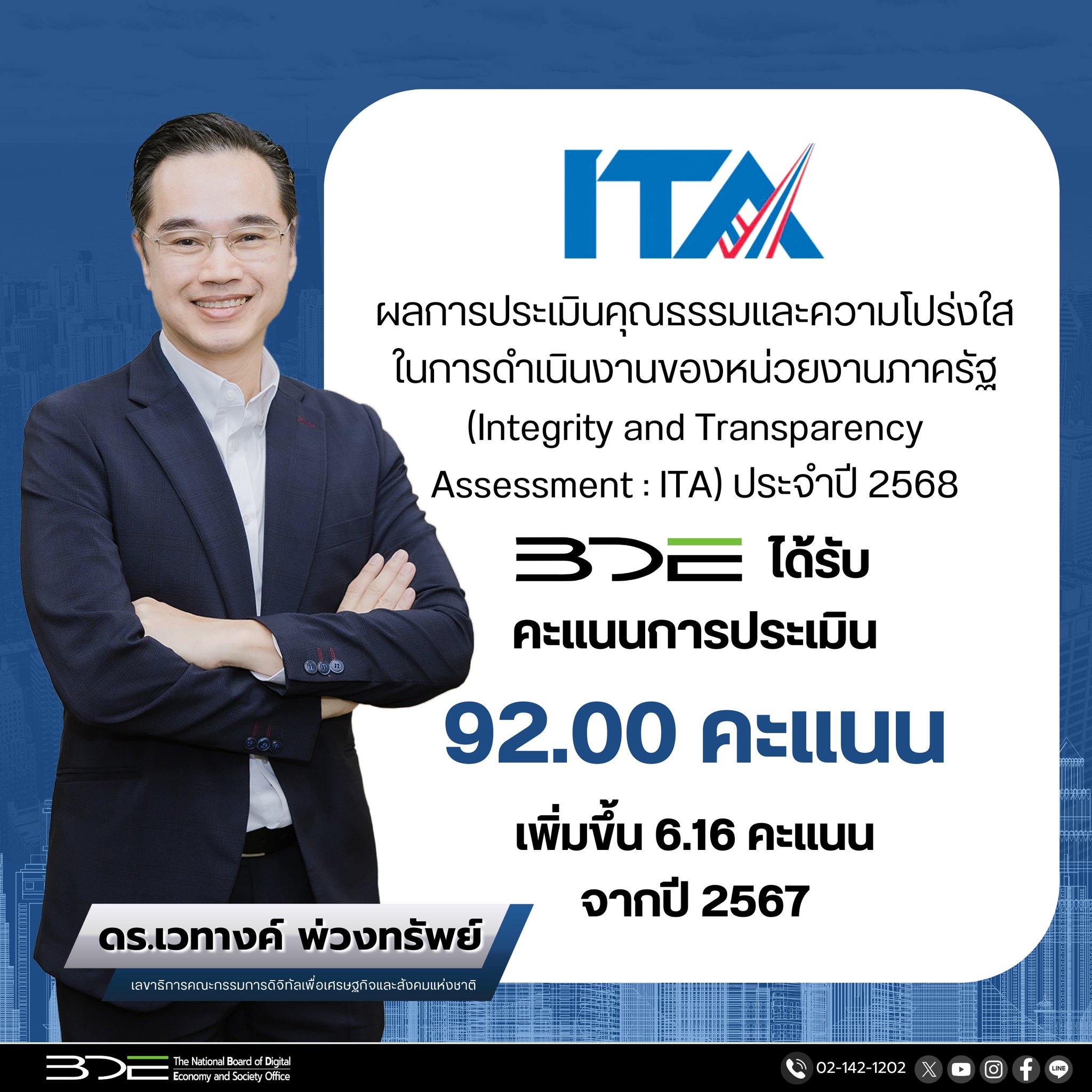 วันนี้ (18 สิงหาคม 2568) นายเวทางค์ พ่วงทรัพย์ เลขาธิการคณะกรรมการดิจิทัลเพื่อเศรษฐกิจและสังคมแห่งชาติ (BDE) เปิดเผยว่า สำนักงานคณะกรรมการป้องกันและปราบปรามการทุจริตแห่งชาติ (สำนักงาน ป.ป.ช.) ได้ประกาศผลการประเมินคุณธรรมและความโปร่งใสในการดำเนินงานของหน่วยงานภาครัฐ (Integrity and Transparency Assessment : ITA) ประจำปีงบประมาณ พ.ศ. 2568 ของสำนักงานคณะกรรมการดิจิทัลเพื่อเศรษฐกิจและสังคมแห่งชาติ ได้รับคะแนน ITA รวม 92.00 คะแนน เพิ่มขึ้น 6.16 คะแนน จากปี 2567 และมีคะแนนรายแบบวัด ประกอบด้วย ผลสำรวจความคิดเห็นผู้มีส่วนได้ส่วนเสียภายใน (Internal Integrity and Transparency Assessment : IIT) 93.8 คะแนน ผลสำรวจความคิดเห็นผู้มีส่วนได้ส่วนเสียภายนอก (External Integrity and Transparency Assessment : EIT) ส่วนที่ 1 BDE 87.33 คะแนน ส่วนที่ 2 ป.ป.ช. 78.37 คะแนน และผลวัดการเปิดเผยข้อมูลสาธารณะ (Open Data Integrity and Transparency Assessment : OIT) 97.5 คะแนน