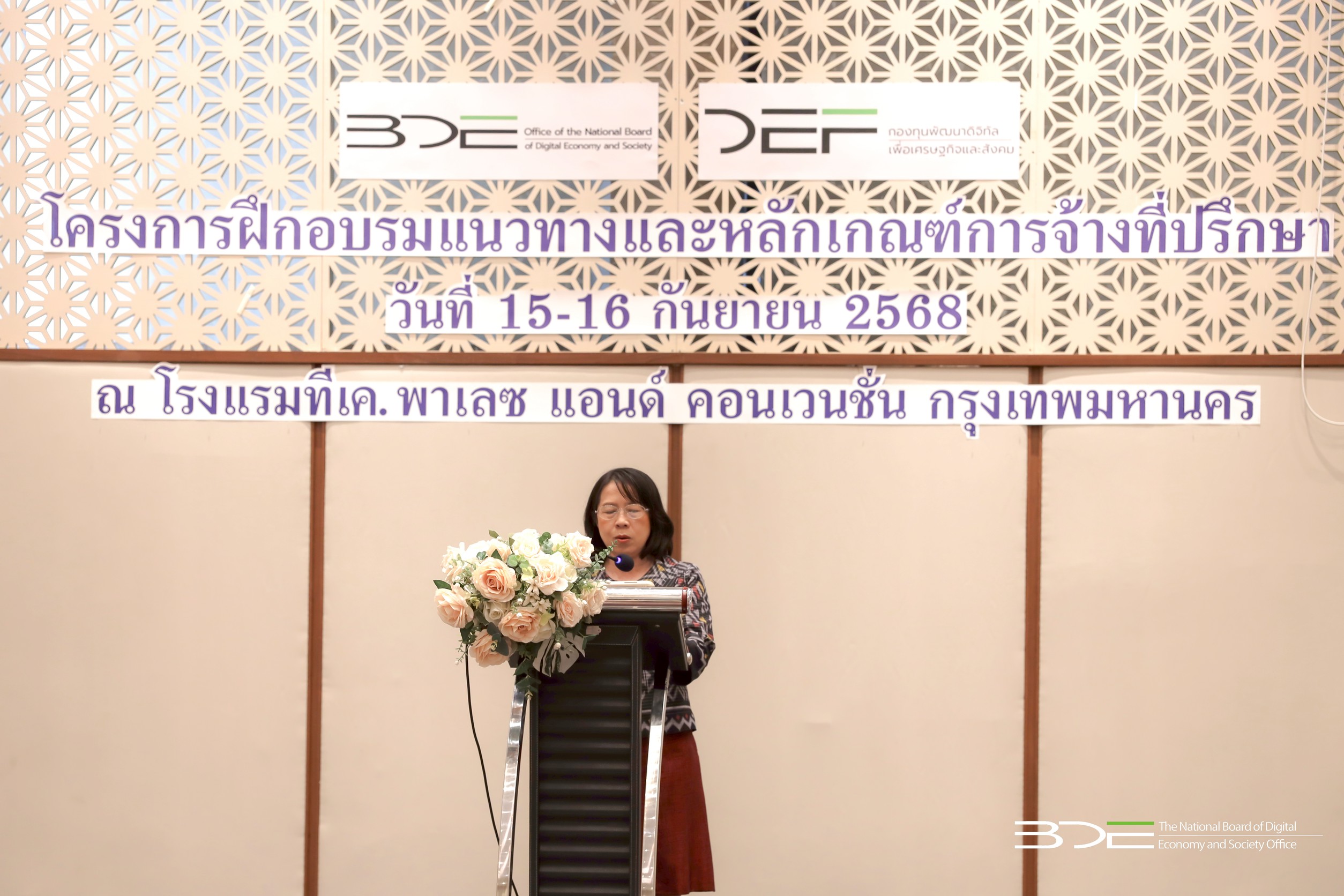 วันนี้ (15 กันยายน 2568) นางอำไพ จิตรแจ่มใส รองเลขาธิการคณะกรรมการดิจิทัลเพื่อเศรษฐกิจและสังคมแห่งชาติ (BDE) เป็นประธานเปิดการฝึกอบรมแนวทางและหลักเกณฑ์การจ้างที่ปรึกษา โดยมีนางสาววรรณศิริ พัวศิริ ผู้อำนวยการกองบริหารกองทุนพัฒนาดิจิทัลเพื่อเศรษฐกิจและสังคม สำนักงานคณะกรรมการดิจิทัลเพื่อเศรษฐกิจและสังคมแห่งชาติ กล่าวรายงาน ตลอดจนข้าราชการ และบุคลากร BDE เข้าร่วมฝึกอบรม ระหว่างวันที่ 15 – 16 กันยายน 2568 ณ โรงแรม ทีเค.พาเลซ แอนด์ คอนเวนชั่น แจ้งวัฒนะ กรุงเทพฯ