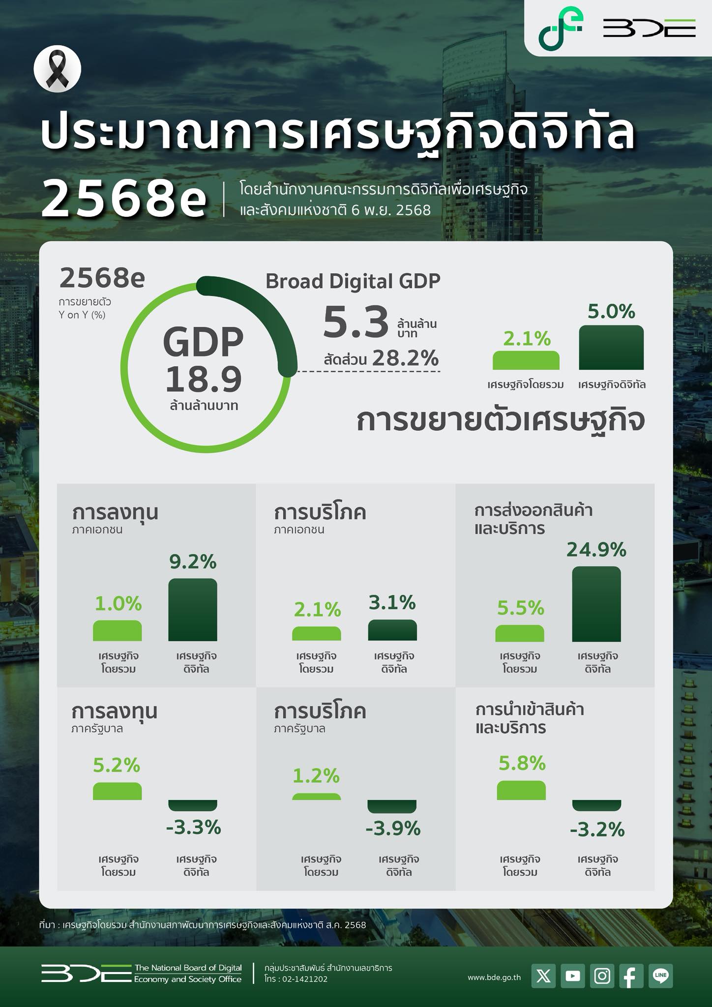 BDE คาดว่า ปี 2569 Digital GDP ขยายตัว ร้อยละ 4.2 ชะลอลงจากปี 2568 ที่คาดว่าขยายตัวร้อยละ 5.0 แต่ Digital GDP ปี 2569 ยังขยายตัวคิดเป็น 2.1 เท่า ของ GDP โดยรวม