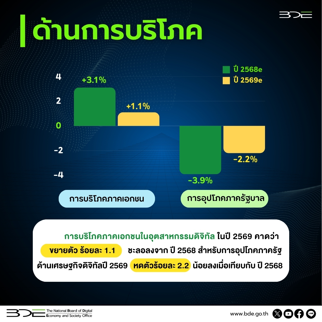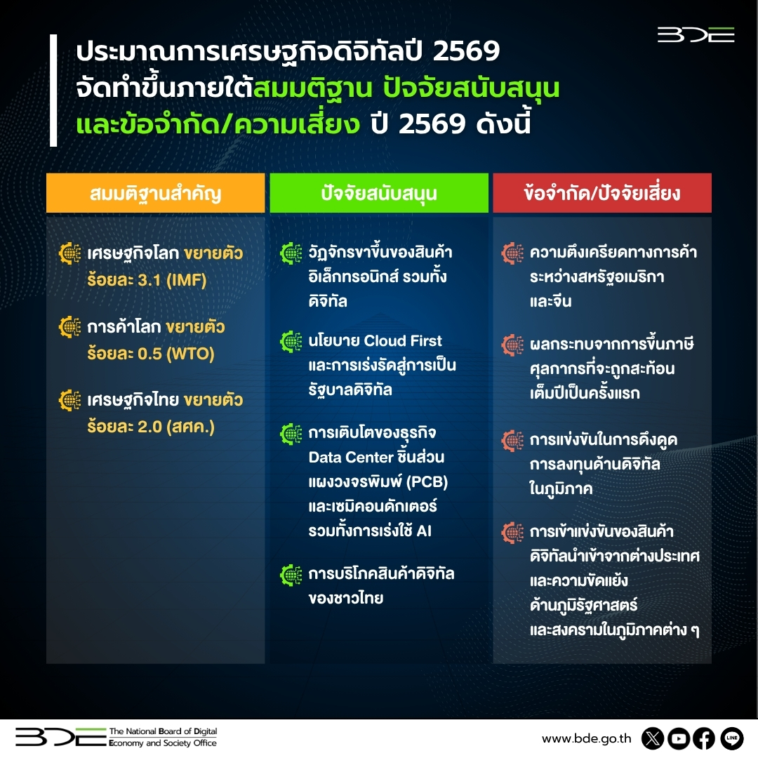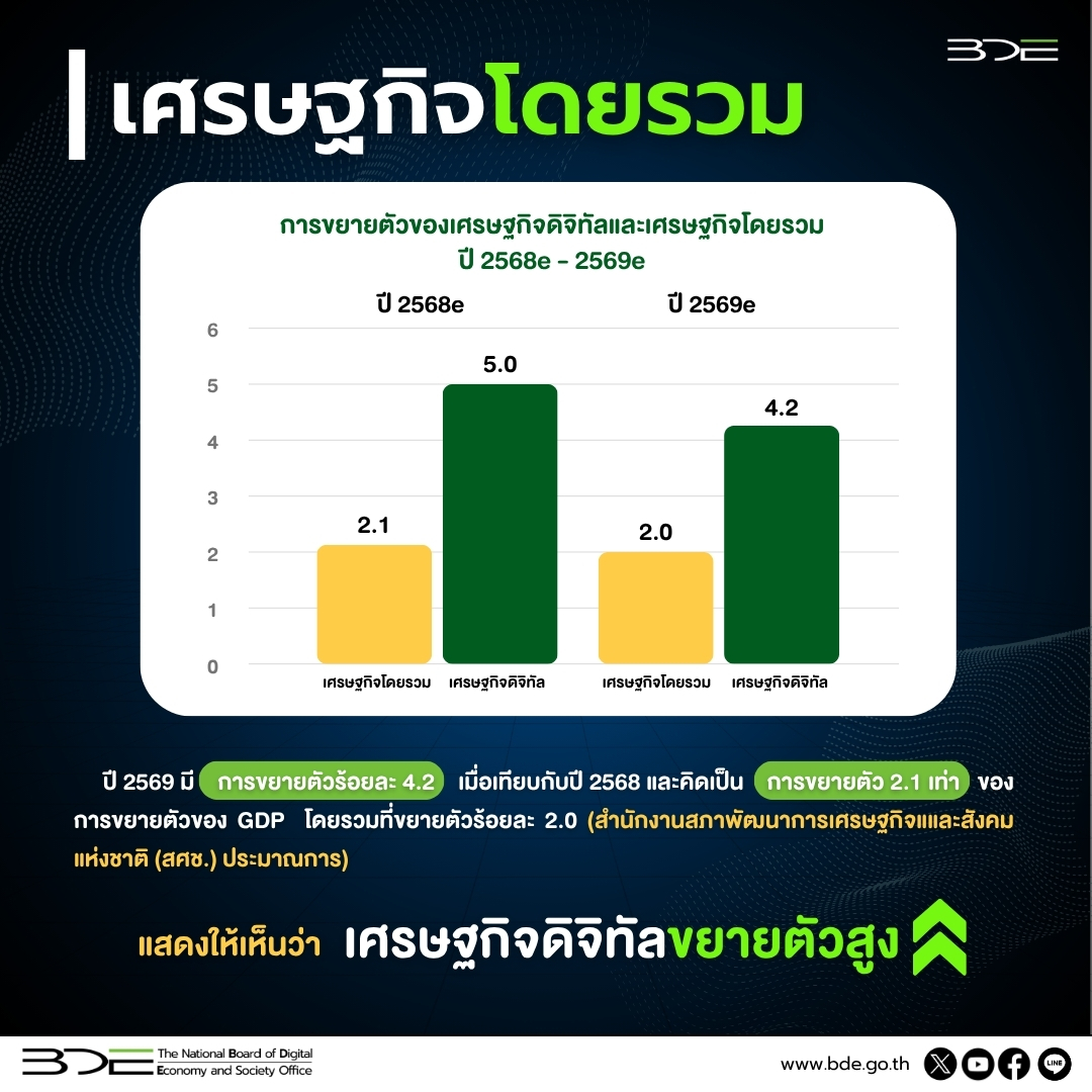 - ปี 2569 Digital GDP ขยายตัว ร้อยละ 4.2 คิดเป็นมูลค่า 5.6 ล้านล้านบาท คิดเป็น 2.1 เท่าของ การขยายตัวของ GDP โดยรวม
