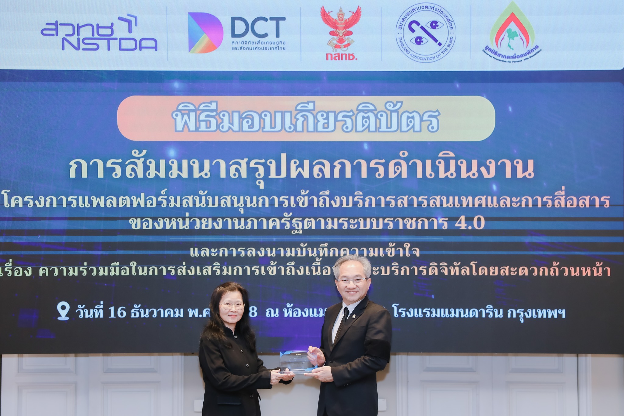 วันนี้ (16 ธันวาคม 2568) นางสาวรัตนา จรูญศักดิ์สิทธิ์ ผู้อำนวยการกองขับเคลื่อนดิจิทัลเพื่อสังคม เป็นผู้แทนสำนักงานคณะกรรมการดิจิทัลเพื่อเศรษฐกิจและสังคมแห่งชาติ (BDE) ร่วมพิธีลงนามบันทึกความเข้าใจ (MOU) เรื่องความร่วมมือในการส่งเสริมการเข้าถึงเนื้อหาและบริการดิจิทัลโดยสะดวกถ้วนหน้า จำนวน 12 หน่วยงาน และเป็นผู้แทน BDE รับมอบเกียรติบัตรการเข้าร่วมกระบวนการพัฒนาและปรับปรุงเว็บไซต์ที่เข้าถึงโดยสะดวกถ้วนหน้าตามมาตรฐาน WCAG ภายใต้โครงการ “แพลตฟอร์มสนับสนุนการเข้าถึงบริการสารสนเทศและการสื่อสารของหน่วยงานภาครัฐตามระบบราชการ 4.0” ณ โรงแรมแมนดาริน กรุงเทพฯ