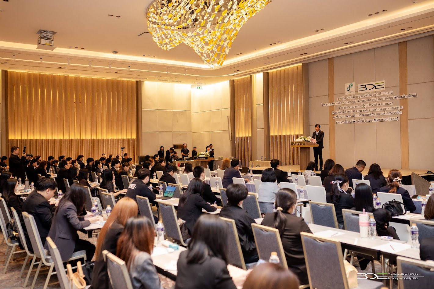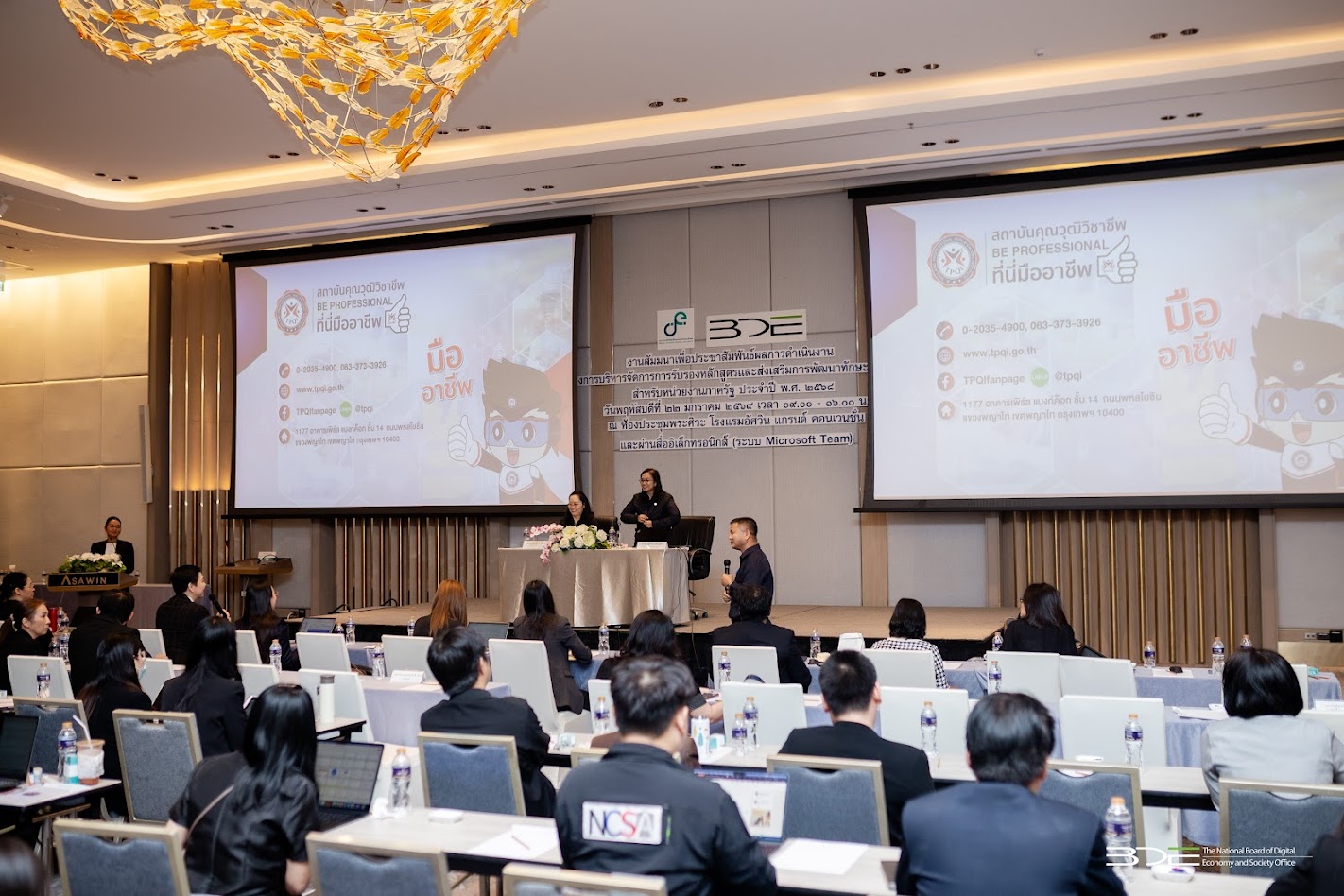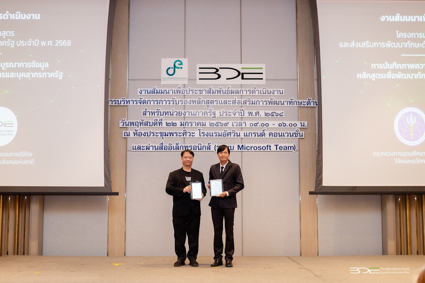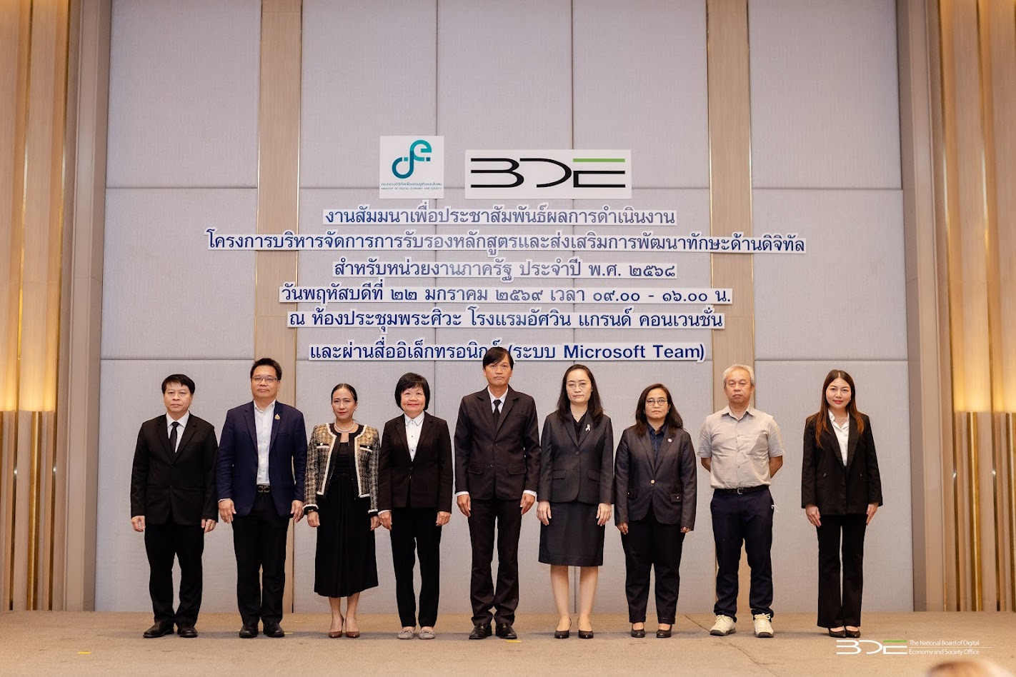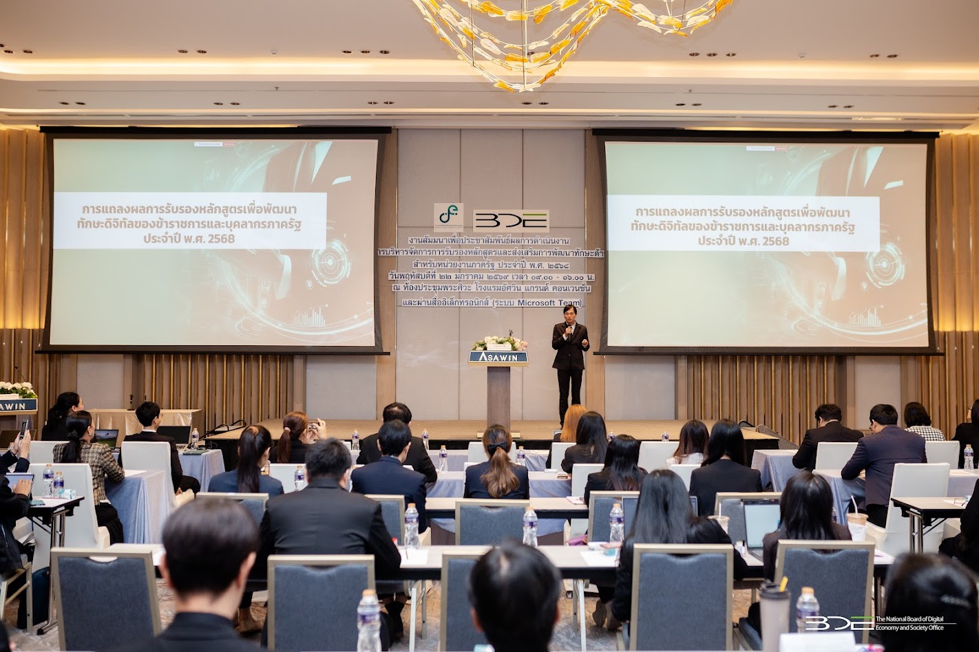 วันนี้ (22 มกราคม 2569) นายธีรวุฒิ ธงภักดิ์ รองเลขาธิการคณะกรรมการดิจิทัลเพื่อเศรษฐกิจและสังคมแห่งชาติ (BDE) เป็นประธานเปิดงานสัมมนาเพื่อประชาสัมพันธ์ผลการดำเนินงาน โครงการบริหารจัดการการรับรองหลักสูตรและส่งเสริมการพัฒนาทักษะด้านดิจิทัลสำหรับหน่วยงานภาครัฐประจำปี พ.ศ. 2568 โดยมีนางสาวพลอยรวี เกริกพันธ์กุล ผู้อำนวยการกองขับเคลื่อนดิจิทัลเพื่อเศรษฐกิจ BDE กล่าวรายงาน โดยมีผู้บริหารหน่วยงานภาครัฐ ภาคเอกชน ภาคธุรกิจ และภาควิชาการ เข้าร่วม ณ โรงแรมอัศวิน แกรนด์ คอนเวนชั่น แจ้งวัฒนะ กรุงเทพฯ และผ่านสื่ออิเล็กทรอนิกส์