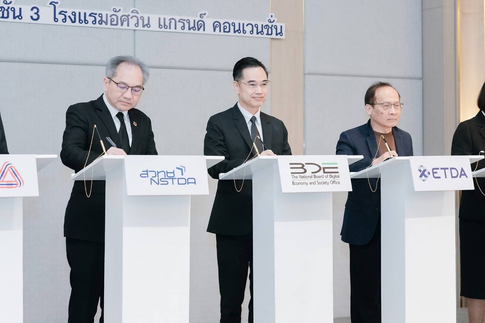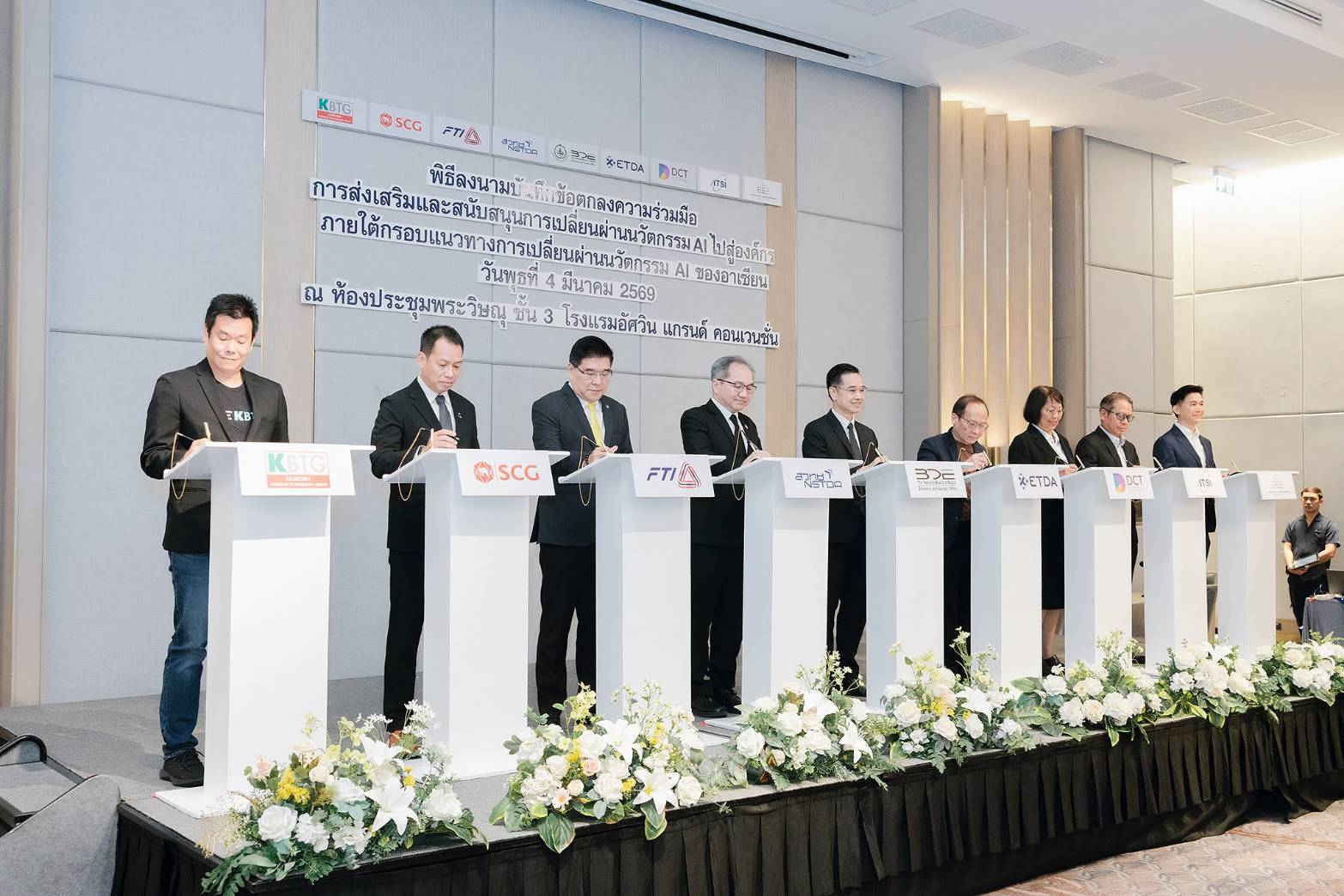นอกจากนี้ การประชุมสัมมนาเพื่อเผยแพร่ผลการศึกษาของโครงการฯ ยังได้มีพิธีลงนามบันทึกข้อตกลงความร่วมมือ (MOU) การส่งเสริมและสนับสนุนการเปลี่ยนผ่านนวัตกรรม AI ไปสู่องค์กร ภายใต้กรอบแนวทางการเปลี่ยนผ่านนวัตกรรม AI ของอาเซียน จำนวน 9 หน่วยงาน ได้แก่ 1) สำนักงานคณะกรรมการดิจิทัลเพื่อเศรษฐกิจและสังคมแห่งชาติ 2) สำนักงานพัฒนาวิทยาศาสตร์และเทคโนโลยีแห่งชาติ 3) สำนักงานพัฒนาธุรกรรมทางอิเล็กทรอนิกส์ 4) สภาอุตสาหกรรมแห่งประเทศไทย 5) สภาดิจิทัลเพื่อเศรษฐกิจและสังคมแห่งประเทศไทย 6) สมาคมอุตสาหกรรมซอฟต์แวร์ไทย 7) มูลนิธิเพื่อการพัฒนาดิจิทัล 8 ) บริษัท กสิกร แล็บส์ จำกัด และ 9) บริษัท ปูนซิเมนต์ไทย จำกัด (มหาชน) โดยมีวัตถุประสงค์เพื่อส่งเสริมและสนับสนุนให้เกิดการนำกรอบแนวทางการเปลี่ยนผ่านนวัตกรรม AI ของอาเซียน มาใช้ในการเปลี่ยนผ่านนวัตกรรม AI ขององค์กร และการพัฒนาบุคลากรไทยให้มีความพร้อมในการใช้และพัฒนา AI รวมถึงสร้างเครือข่ายความร่วมมือการพัฒนากรอบแนวทางการเปลี่ยนผ่านนวัตกรรม AI ของอาเซียน ให้รองรับการปรับเปลี่ยนทางด้าน AI และกรอบความตกลงที่เกี่ยวข้องภายใต้ประชาคมอาเซียน ทั้งยังเป็นการร่วมกันแบ่งปัน และเผยแพร่ความรู้ ประสบการณ์การนำ AI มาใช้ในองค์กรอย่างเหมาะสมและปลอดภัย