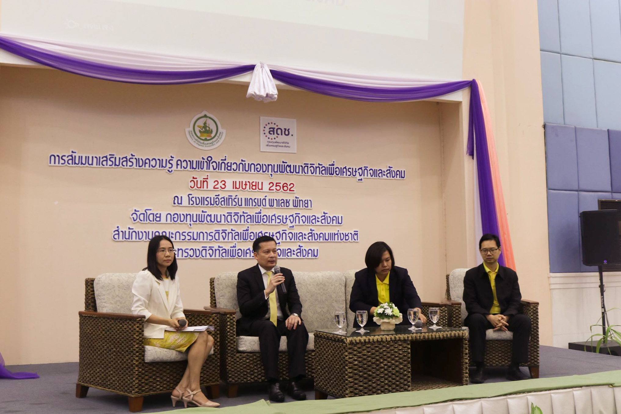 เมื่อวันที่ 23 เมษายน 2562 กองทุนพัฒนาดิจิทัลเพื่อเศรษฐกิจและสังคม(กองทุนดีอี) สำนักงานคณะกรรมการดิจิทัลเพื่อเศรษฐกิจและสังคมแห่งชาติ (สดช.) ได้จัดสัมมนาเสริมสร้างความรู้ ความเข้าใจเกี่ยวกับกองทุนพัฒนาดิจิทัลเพื่อเศรษฐกิจและสังคม ครั้งที่ 4/2562 ณ โรงแรมอีสเทิร์น แกรนด์ พาเลซ จังหวัดชลบุรี โดย นายธเนศ วิริยะจิตต์ ผู้อำนวยการกองบริหารกองทุนพัฒนาดิจิทัลเพื่อเศรษฐกิจและสังคม (สดช.) เป็นประธานในพิธีเปิดการสัมมนาในประเด็นเรื่อง “กองทุนพัฒนาดิจิทัลเพื่อเศรษฐกิจและสังคม” ภายใต้สำนักงานคณะกรรมการดิจิทัลเพื่อเศรษฐกิจและสังคมแห่งชาติ และบรรยายเรื่อง “แนวทางการขอรับการจัดสรรเงินกองทุนพัฒนาดิจิทัลเพื่อเศรษฐกิจและสังคม” นอกจากนี้ ยังมีเวทีเสวนา “กองทุนดีอี โอกาสของการพัฒนาประเทศด้วยเทคโนโลยีดิจิทัลในมือคุณ” โดย มีผู้ร่วมเสวนาประกอบด้วย ผู้อำนวยการกองบริหารกองทุนพัฒนาดิจิทัลเพื่อเศรษฐกิจและสังคม ผู้แทนสำนักงานส่งเสริมดิจิทัล (depa) และเจ้าหน้าที่กองบริหารกองทุนพัฒนาดิจิทัลเพื่อเศรษฐกิจและสังคม