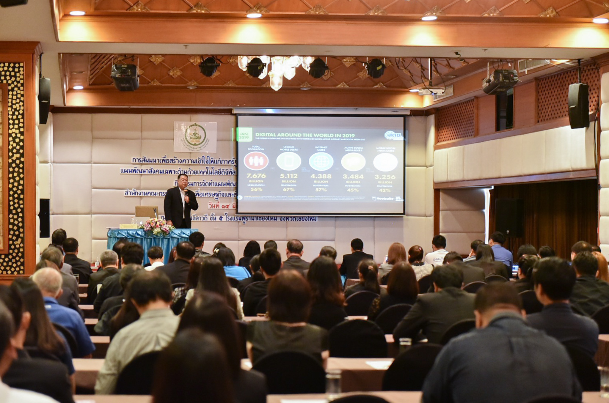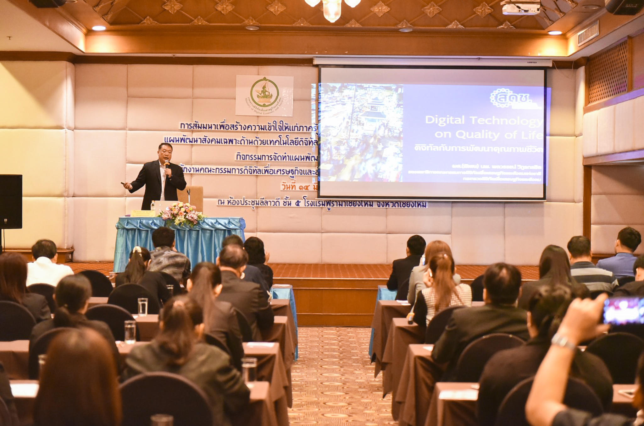 สำนักงานคณะกรรมการดิจิทัลเพื่อเศรษฐกิจและสังคมแห่งชาติ (สดช.) จัดสัมมนาเพื่อสร้างความเข้าใจให้แก่ภาครัฐ ภาคเอกชน และประชาชนเกี่ยวกับนโยบายและแผนพัฒนาสังคมเฉพาะด้านด้วยเทคโนโลยีดิจิทัล และบริการภาครัฐและเอกชนผ่านเทคโนโลยีดิจิทัล การพัฒนาสังคมด้วยเทคโนโลยีดิจิทัล : Upgrading Thailand’s Digital Society ครั้งที่ 3 เมื่อวันที่ 14 มิถุนายน 2562 ณ โรงแรมฟูราม่า จังหวัดเชียงใหม่ โดยนายพลวรรธน์ วิทูรกลชิต รองเลขาธิการคณะกรรมการดิจิทัลเพื่อเศรษฐกิจและสังคมแห่งชาติ ให้เกียรติเป็นประธานในพิธีการเปิด พร้อมปาฐกถาในหัวข้อเรื่อง “ดิจิทัลกับการพัฒนาคุณภาพชีวิต” ให้กับหน่วยงานภาครัฐ ภาคเอกชน และภาคส่วนการศึกษา พร้อมเป็นตัวแทนมอบครุภัณฑ์ครุภัณฑ์ให้กับศูนย์ดิจิทัลชุมชนต้นแบบศูนย์ต้นแบบพระธาตุห้าดวง อำเภอลี้ จ.ลำพูน เพื่อขับเคลื่อนการดำเนินงานศูนย์ดิจิทัลชุมชนให้พัฒนาศักยภาพในการให้บริการดิจิทัลในระดับชุมชนให้มีศักยภาพมากยิ่งขึ้น ส่งผลต่อการลดช่องว่างทางดิจิทัลของพื้นที่