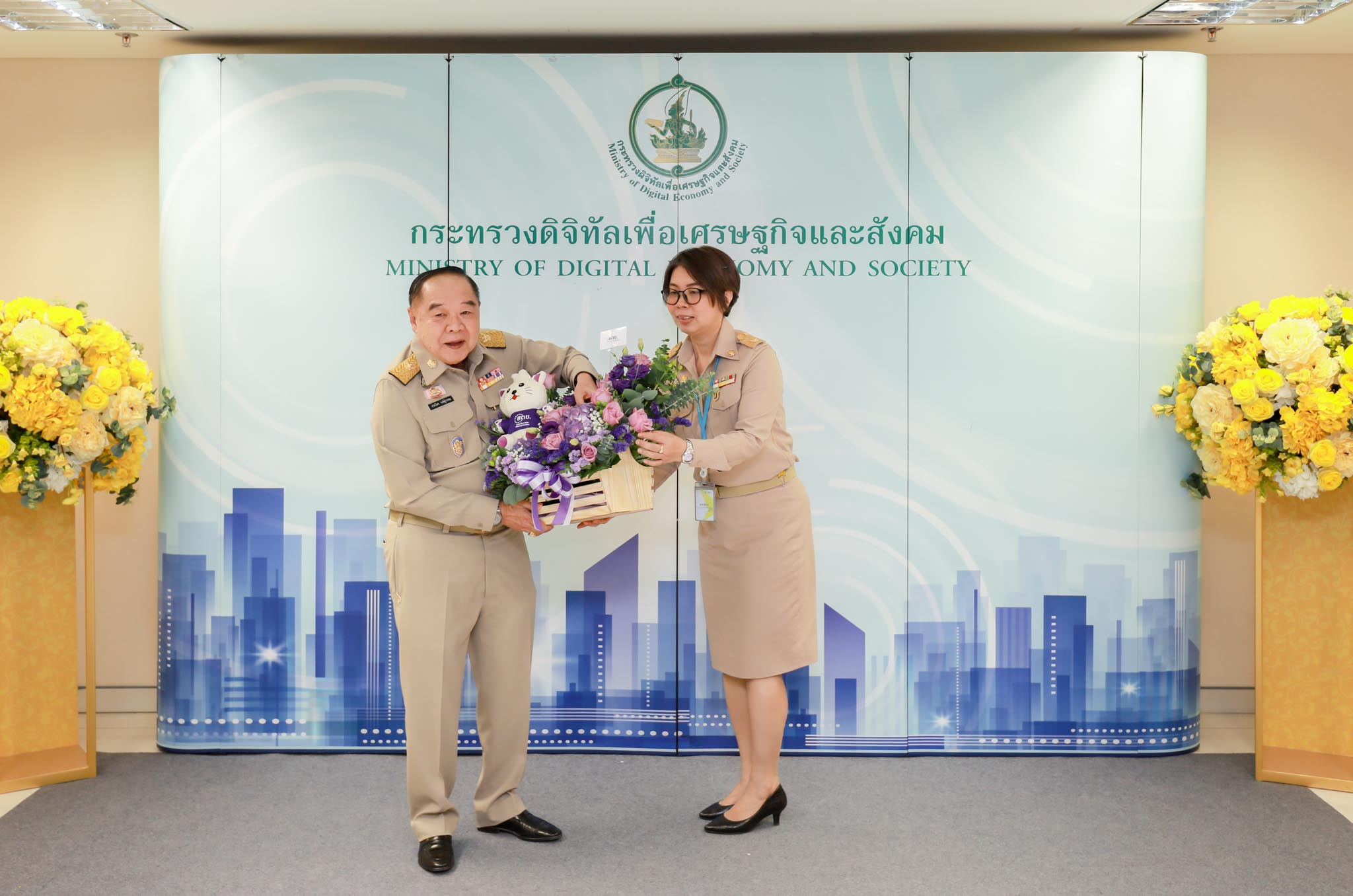 พลเอก ประวิตร วงษ์สุวรรณ รองนายกรัฐมนตรีฝ่ายความมั่นคง ตรวจเยี่ยมและมอบนโยบายการปฏิบัติราชการของรัฐบาล และกระทรวงดิจิทัลเพื่อเศรษฐกิจและสังคม พร้อมมอบนโยบายการดำเนินงาน 9 ข้อ ที่ครอบคลุมการดำเนินงานพัฒนาทั้งด้านเศรษฐกิจ สังคม และความมั่นคง โดยมี นายพุทธิพงษ์ ปุณณกันต์ รัฐมนตรีว่าการกระทรวงดิจิทัลเพื่อเศรษฐกิจและสังคม นางสาวอัจฉรินทร์ พัฒนพันธ์ชัย ปลัดกระทรวงดิจิทัลเพื่อเศรษฐกิจและสังคม น.อ.สมศักดิ์ ขาวสุวรรณ์ รองปลัดกระทรวงดิจิทัลเพื่อเศรษฐกิจและสังคม นางวรรณพร เทพหัสดิน ณ อยุธยา รองปลัดกระทรวงดิจิทัลเพื่อเศรษฐกิจและสังคม นางปิยนุช วุฒิสอน เลขาธิการคณะกรรมการดิจิทัลเพื่อเศรษฐกิจและสังคมแห่งชาติ พร้อมด้วยผู้บริหารระดับสูงของกระทรวงดิจิทัลเพื่อเศรษฐกิจและสังคมและหน่วยงานในสังกัด ให้การต้อนรับและรับฟังแนวนโยบาย เมื่อวันที่ 26 สิงหาคม 2562 ณ กระทรวงดิจิทัลเพื่อเศรษฐกิจและสังคม