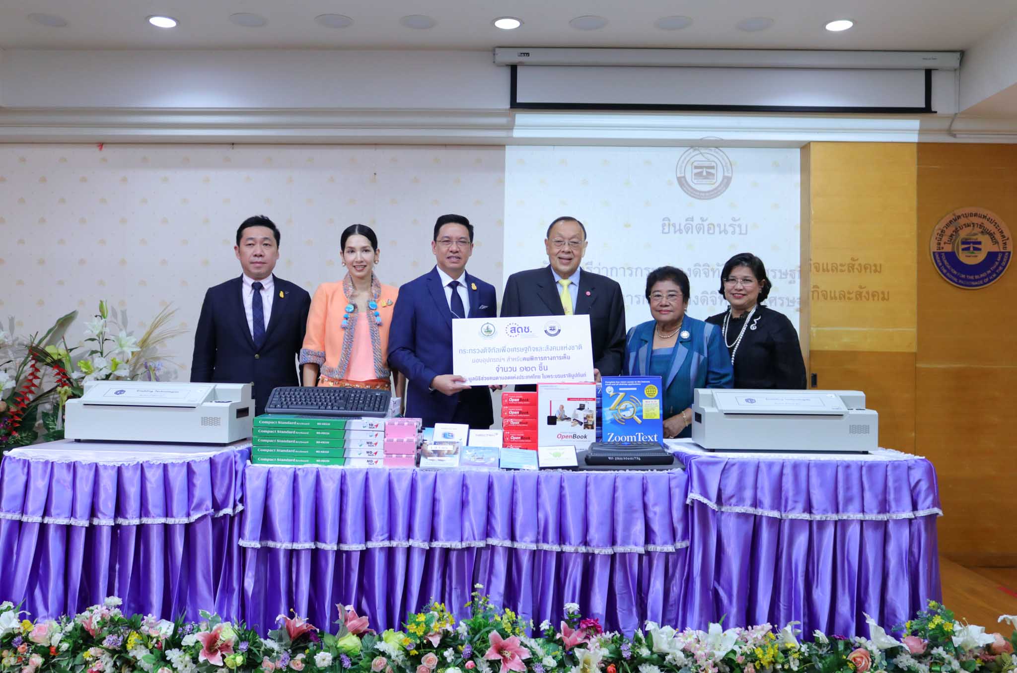 สำนักงานคณะกรรมการดิจิทัลเพื่อเศรษฐกิจและสังคมแห่งชาติ หรือ สดช. ร่วมงานพิธีส่งมอบอุปกรณ์และเครื่องมือสําหรับผู้พิการทางการเห็น จัดโดยกระทรวงดิจิทัลเพื่อเศรษฐกิจและสังคม ซึ่งการเข้าร่วมงาน ในครั้งนี้ เป็นร่วมขับเคลื่อนนโยบายของกระทรวง ฯ ที่เป็นหน่วยงานหลักในการรับผิดชอบ เรื่องการลดความเหลื่อมล้ำ ในการเข้าถึงเทคโนโลยีสารสนเทศ เพื่อให้เกิดการพัฒนาสังคมแห่งความเท่าเทียม โดย ได้มีการประกาศใช้กฎกระทรวงเทคโนโลยี สารสนเทศแลการสื่อสาร กําหนดหลักเกณฑ์ วิธีการ และเงื่อนไขในการเข้าถึงและใช้ประโยชน์จากข้อมูลข่าวสารการสื่อสารบริการโทรคมนาคมเทคโนโลยีสารสนเทศและ การสื่อสารเทคโนโลยีสิ่งอํานวยความสะดวกเพื่อการสื่อสารและบริการสื่อสาธารณะ สําหรับคนพิการ พ.ศ. 2554 ซึ่งภารกิจหนึ่งภายใต้กฎกระทรวงฉบับนี้ คือ การจัดให้มีการให้หรือให้ยืมเทคโนโลยีสารสนเทศและการสื่อสาร หรือสิ่งอํานวยความสะดวก เพื่อการสื่อสารแก่คนพิการ และเมื่อวันที่ 20 กันยายน 2562 คณะอนุกรรมส่งเสริมและพัฒนาการเข้าถึงและใช้ประโยชน์จากข้อมูลข่าวสารการสื่อสารบริการโทรคมนาคม เทคโนโลยีสิ่งอํานวยความสะดวกเพื่อการสื่อสาร และบริการสื่อสาธารณะ สําหรับคนพิการได้มีมติเห็นชอบอนุมัติให้และให้ยืมอุปกรณ์เครื่องมือเทคโนโลยีสารสนเทศหรือเทคโนโลยีสิ่งอํานวยความสะดวก จํานวน 123 ชิ้น ให้กับมูลนิธิช่วยคนตาบอดแห่งประเทศไทยในพระบรมราชินูปถัมภ์ เพื่อนําไปใช้ประโยชน์ในการฝึกทักษะให้คนพิการสามารถนําไปเป็นเครื่องมือในการเรียนรู้ด้านต่างๆเพื่อใช้ประโยชน์ในการดํารงชีวิตประจําวันและสร้างรายได้ให้กับตนเองและครอบครัว เพื่อพัฒนาคุณภาพชีวิตที่ยั่งยืนของคนตาบอดต่อไป