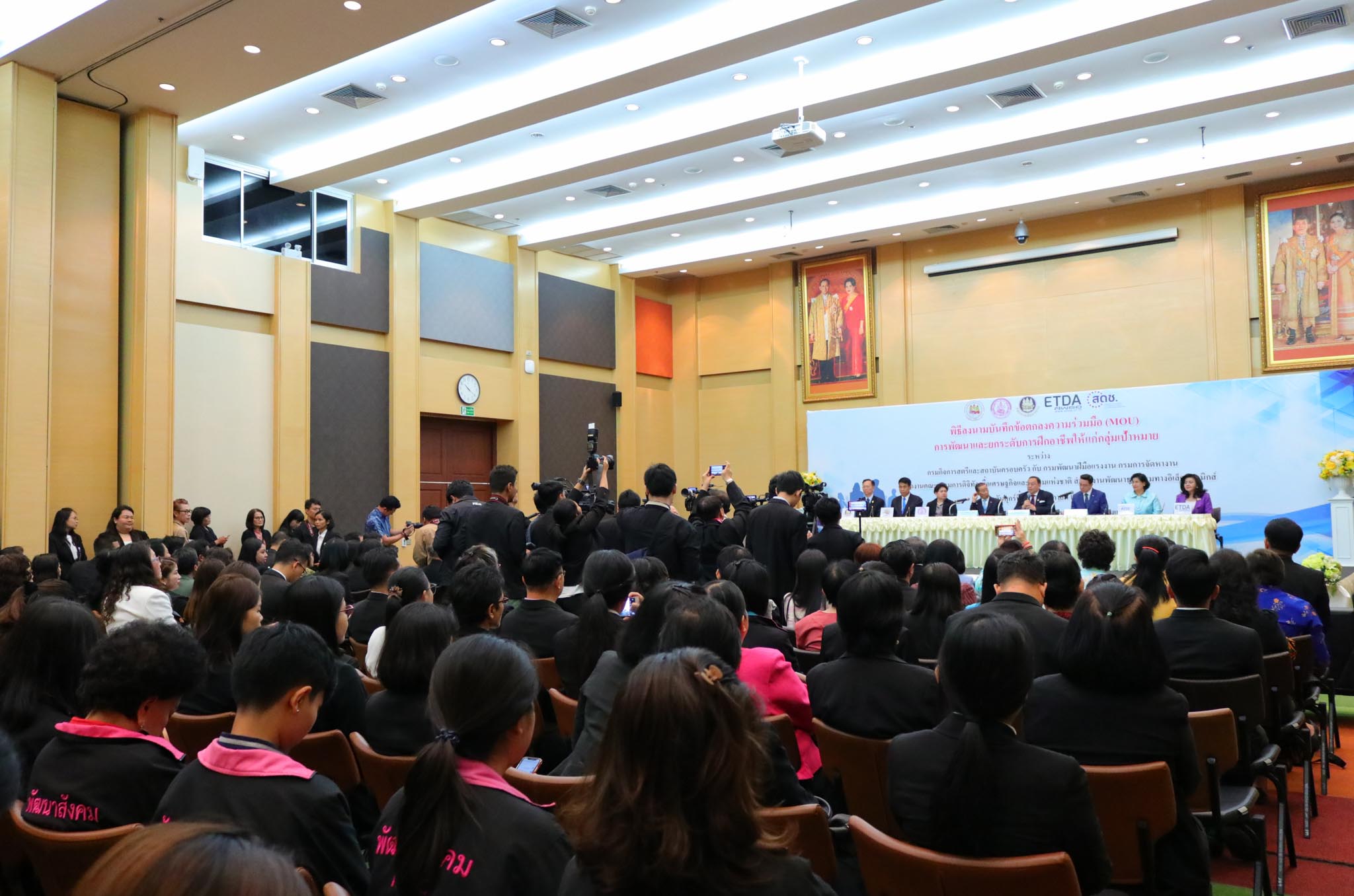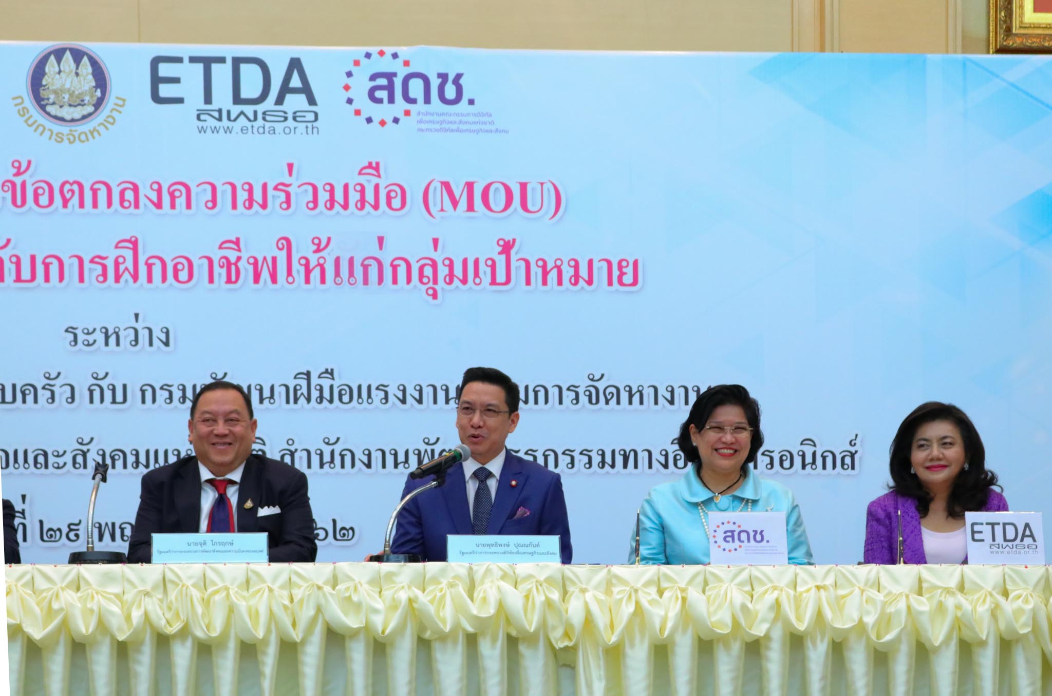 นายพุทธิพงษ์ ปุณณกันต์ รัฐมนตรีว่าการกระทรวงดิจิทัลเพื่อเศรษฐกิจและสังคม ร่วมเป็นเกียรติในพิธีลงนามบันทึกข้อตกลงความร่วมมือการพัฒนาและยกระดับการฝึกอาชีพให้แก่กลุ่มเป้าหมาย ที่กระทรวงดิจิทัลเพื่อเศรษฐกิจและสังคม โดยสำนักงานคณะกรรมการดิจิทัลเพื่อเศรษฐกิจและสังคมแห่งชาติ (สดช.) กรมกิจการสตรีและสถาบันครอบครัว กระทรวงการพัฒนาสังคมและความมั่นคงของมนุษย์ และกรมพัฒนาฝีมือแรงงาน กระทรวงแรงงาน ได้จัดทำขึ้น เมื่อวันที่ 29 พ.ย. 62 ณ ห้องประชุมปกรณ์ อังศุสิงห์ ชั้น 2 อาคารกรมพัฒนาสังคมและสวัสดิการ กระทรวงการพัฒนาสังคมและความมั่นคงของมนุษย์ เพื่อประสานความร่วมมือในการส่งเสริมและพัฒนาทักษะอาชีพแก่กลุ่มเป้าหมาย โดยมี นางวรรณพร เทพหัสดิน ณ อยุธยา เลขาธิการ สดช. เข้าร่วมงานดังกล่าว
