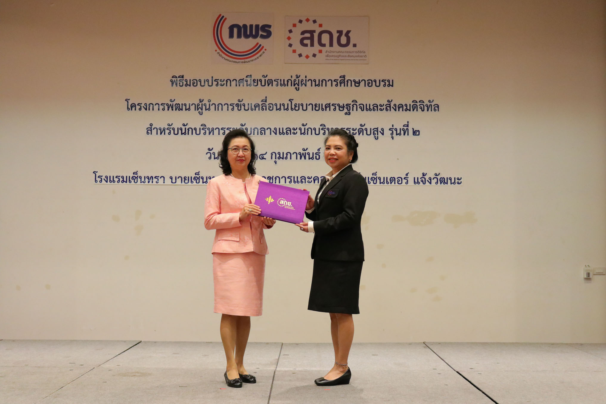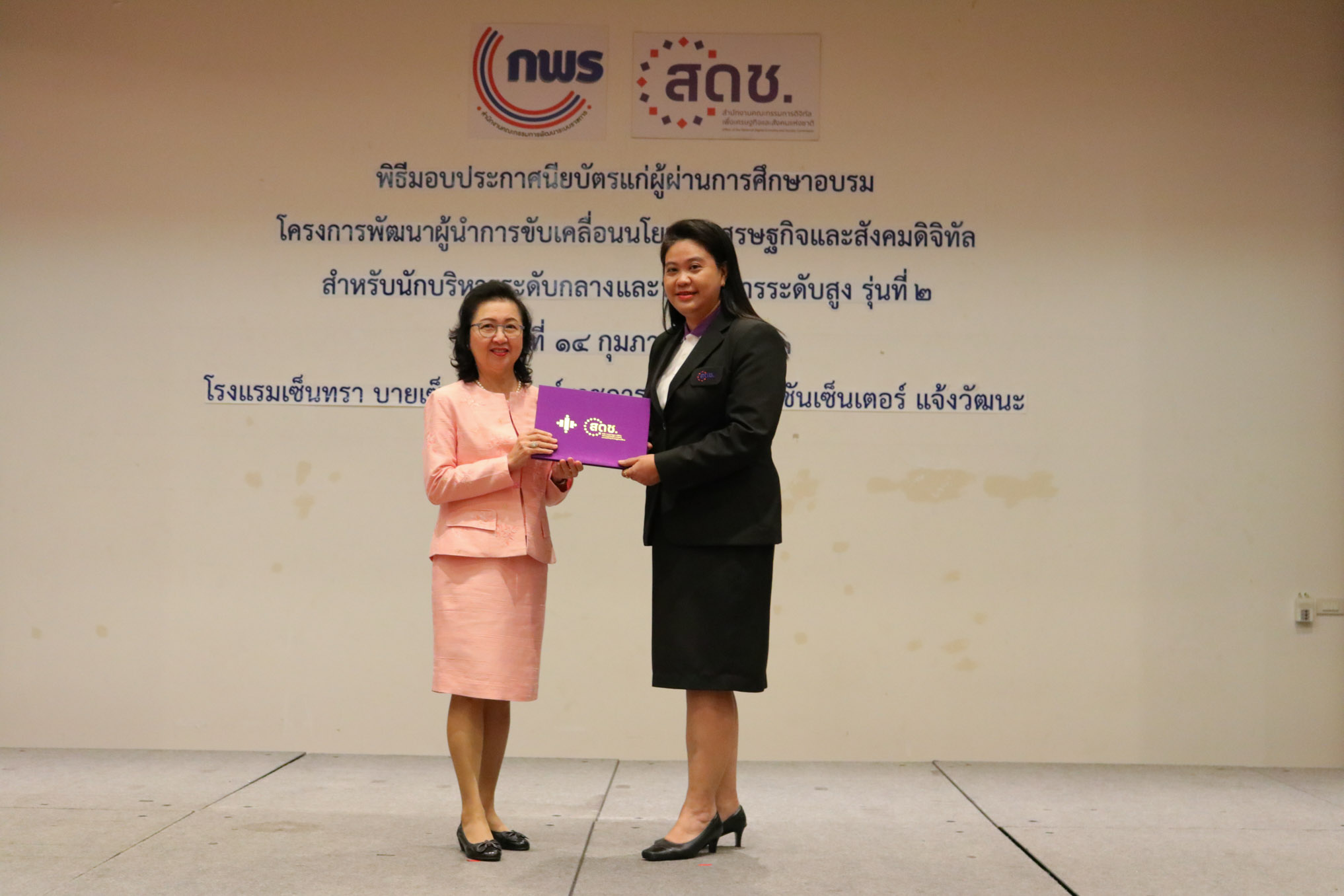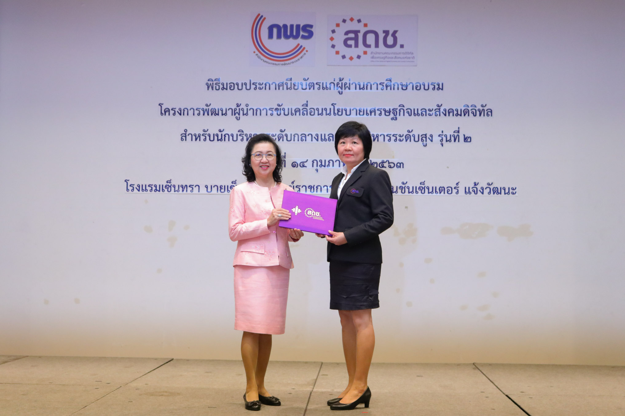 สำนักงานคณะกรรมการดิจิทัลเพื่อเศรษฐกิจและสังคมแห่งชาติ (สดช) จัดพิธีมอบประกาศนียบัตรแก่ผู้ผ่านการฝึกอบรม หลักสูตรผู้นำการขับเคลื่อนนโยบายเศรษฐกิจและสังคมดิจิทัลระดับกลางรุ่นที่ 1 จำนวน 20 คน และหลักสูตรการพัฒนานักบริหารนโยบายเศรษฐกิจและสังคมดิจิทัลระดับสูง รุ่นที่ 2 จำนวน 40 คน เมื่อวันที่ 14 กุมภาพันธ์ 2563 ณ ห้องประชุมบีบี โรงแรมเซ็นทรา บายเซ็นทาราศูนย์ราชการและคอนแวนชันเซ็นเตอร์ แจ้งวัฒนะ โดยมีนางกิตติยา คัมภีร์ ผู้อำนวยการสถาบันส่งเสริมการบริหารกิจการบ้านเมืองที่ดี สำนักงาน ก.พ.ร. เป็นผู้มอบประกาศนียบัตร โดยหลักสูตรดังกล่าวมีเป้าหมาย เพื่อให้ข้าราชการเป็นผู้นำการเปลี่ยนแปลงในการพัฒนาข้อเสนอ นโยบาย และยุทธศาสตร์ ตลอดจนเป็นผู้นำในการริเริ่มขับเคลื่อน และติดตามประเมินผลการพัฒนาหน่วยงานและประเทศภายใต้นโยบายดิจิทัลเพื่อเศรษฐกิจและสังคม จัดโดยสำนักงาน ก.พ.ร .โดยผู้ผ่านการฝึกอบรมจะได้พัฒนาการทำงานให้ดีขึ้น ซึ่งจะเกิดประโยชน์สูงสุดแก่ สดช. และประเทศชาติต่อไป