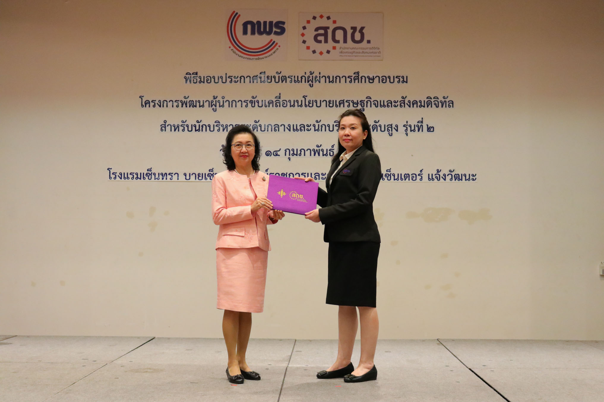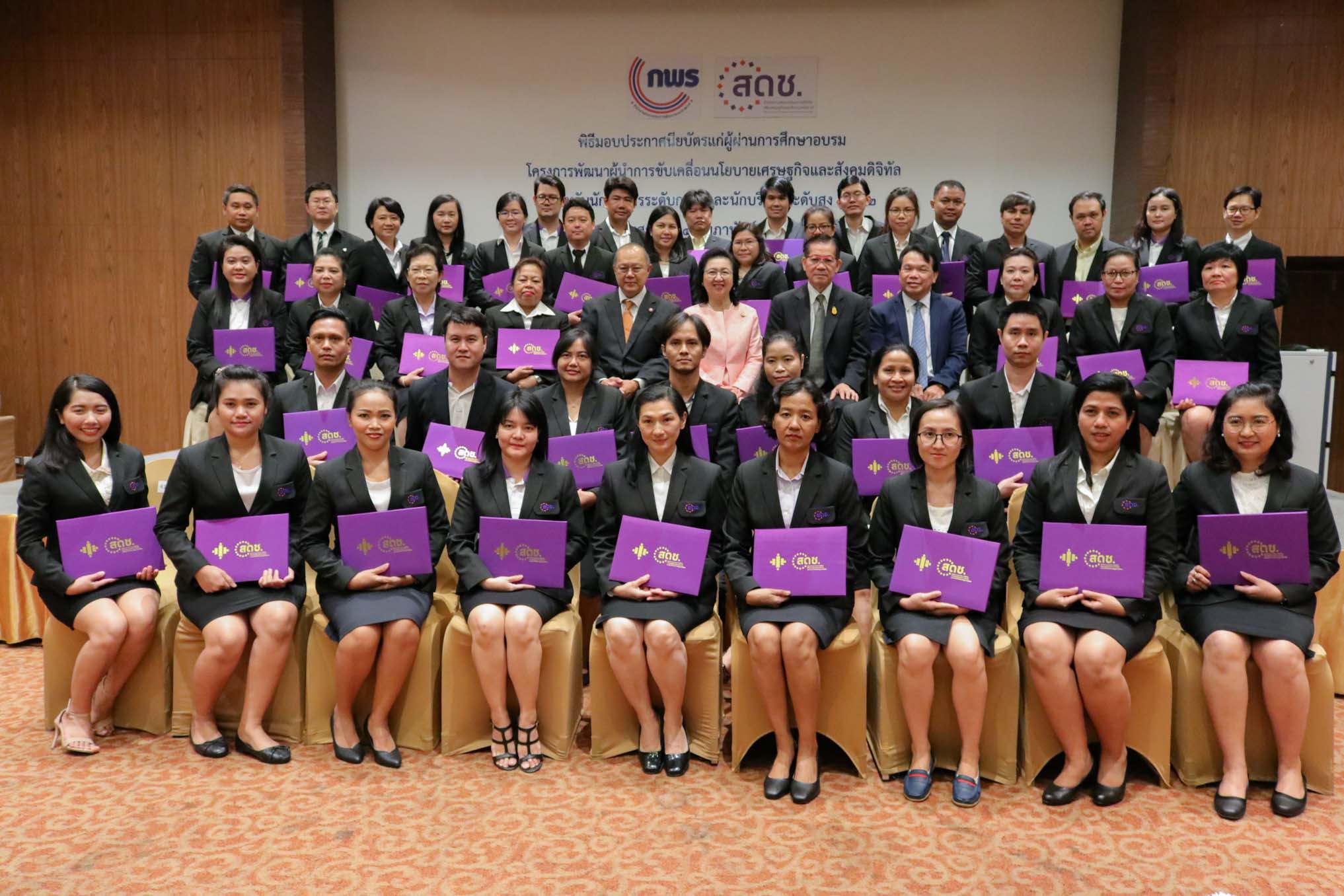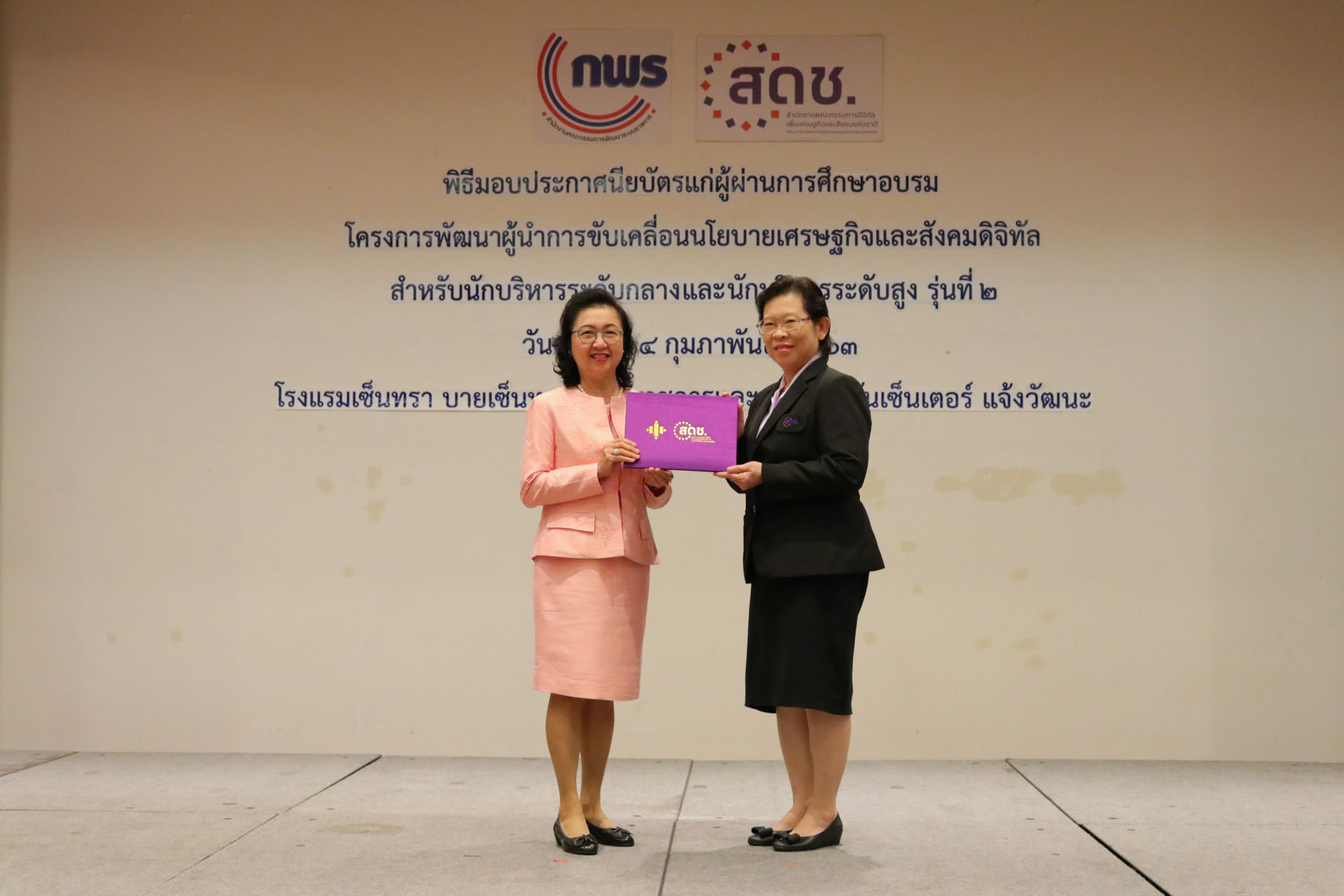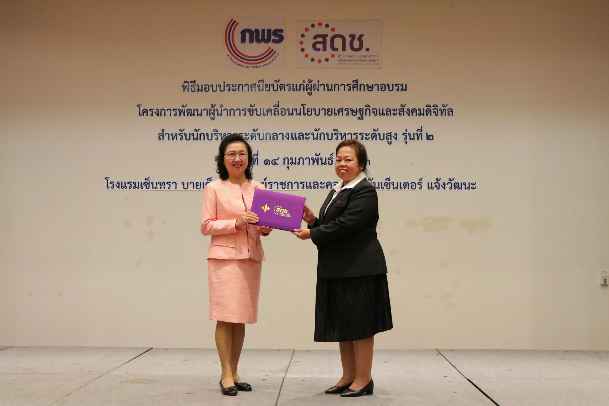 สำนักงานคณะกรรมการดิจิทัลเพื่อเศรษฐกิจและสังคมแห่งชาติ (สดช) จัดพิธีมอบประกาศนียบัตรแก่ผู้ผ่านการฝึกอบรม หลักสูตรผู้นำการขับเคลื่อนนโยบายเศรษฐกิจและสังคมดิจิทัลระดับกลางรุ่นที่ 1 จำนวน 20 คน และหลักสูตรการพัฒนานักบริหารนโยบายเศรษฐกิจและสังคมดิจิทัลระดับสูง รุ่นที่ 2 จำนวน 40 คน เมื่อวันที่ 14 กุมภาพันธ์ 2563 ณ ห้องประชุมบีบี โรงแรมเซ็นทรา บายเซ็นทาราศูนย์ราชการและคอนแวนชันเซ็นเตอร์ แจ้งวัฒนะ โดยมีนางกิตติยา คัมภีร์ ผู้อำนวยการสถาบันส่งเสริมการบริหารกิจการบ้านเมืองที่ดี สำนักงาน ก.พ.ร. เป็นผู้มอบประกาศนียบัตร โดยหลักสูตรดังกล่าวมีเป้าหมาย เพื่อให้ข้าราชการเป็นผู้นำการเปลี่ยนแปลงในการพัฒนาข้อเสนอ นโยบาย และยุทธศาสตร์ ตลอดจนเป็นผู้นำในการริเริ่มขับเคลื่อน และติดตามประเมินผลการพัฒนาหน่วยงานและประเทศภายใต้นโยบายดิจิทัลเพื่อเศรษฐกิจและสังคม จัดโดยสำนักงาน ก.พ.ร .โดยผู้ผ่านการฝึกอบรมจะได้พัฒนาการทำงานให้ดีขึ้น ซึ่งจะเกิดประโยชน์สูงสุดแก่ สดช. และประเทศชาติต่อไป